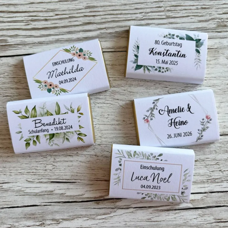Überraschen Sie Ihre Gäste zur Einschulung oder zum Schulanfang mit einer liebevoll personalisierten Vollmilch-Schokolade. Diese kleinen, aber feinen Schokotäfelchen sind das ideale Gastgeschenk – nicht nur lecker, sondern auch ein herziges Andenken an Ihren ganz besonderen Tag. Die Vorderseite der Banderole wird mit Ihren Wunschdaten in einem floralen Design gestaltet, während die Rückseite eine herzliche Botschaft ziert. Wählen Sie Ihre persönliche Wunschkombination für Vorder- und Rückseite aus den Motiven in der Fotogalerie aus. Jedes Motiv ist für jeden Anlass wählbar.