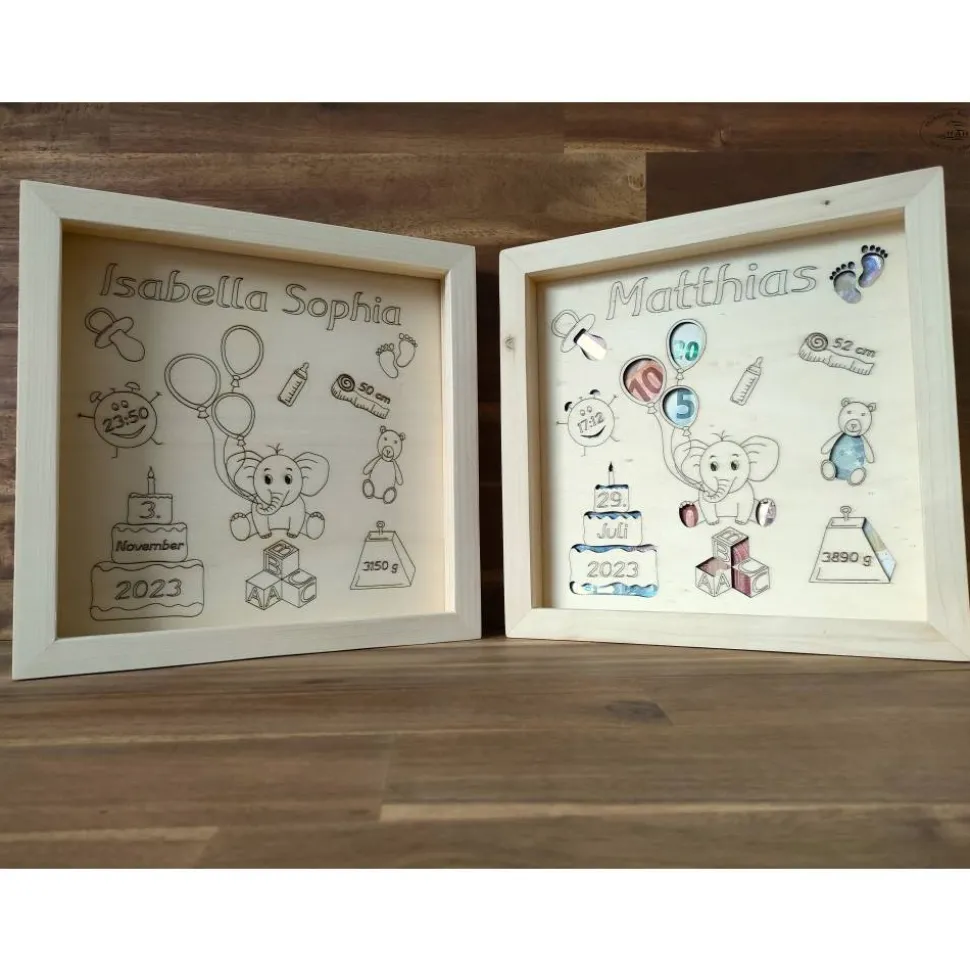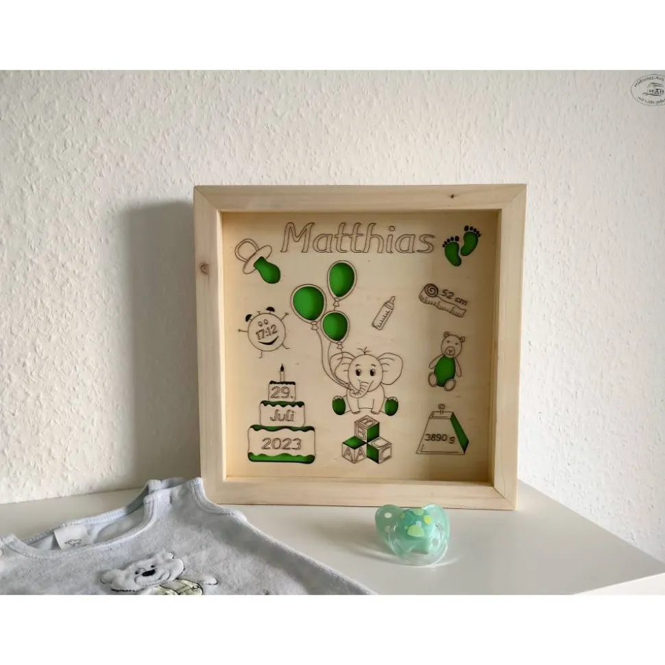 Der Bilderrahmen wurde in liebevoller Handarbeit aus Fichtenholz gefertigt. Das Inlay aus Pappelholz wird mit den Geburtsdaten des Kindes und den liebevoll entworfenen, abgebildeten Motiven graviert.