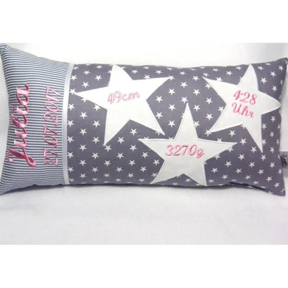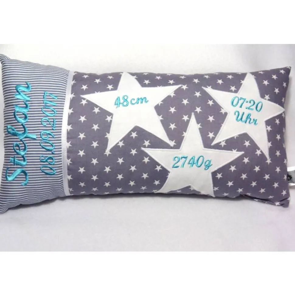 Dieses liebevoll bestickte Namenskissen (20cm x 40cm) wird aus hochwertigen Baumwollstoffen in grau/weiß gefertigt und mit drei Sternen sowie den individuellen Geburtsdaten des Babys gestaltet. Ob für Jungen oder Mädchen – das Geburtskissen ist ein echter Hingucker im Kinderzimmer und bleibt viele Jahre eine wundervolle Erinnerung.