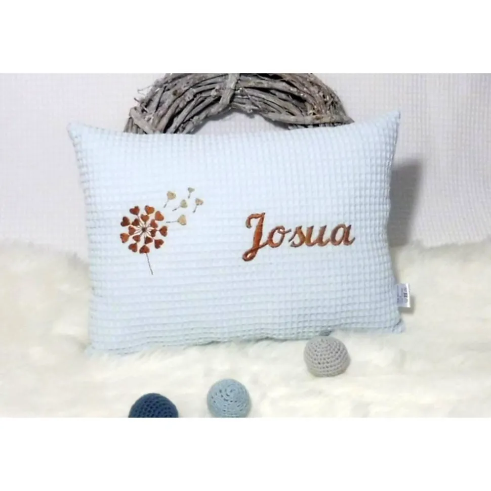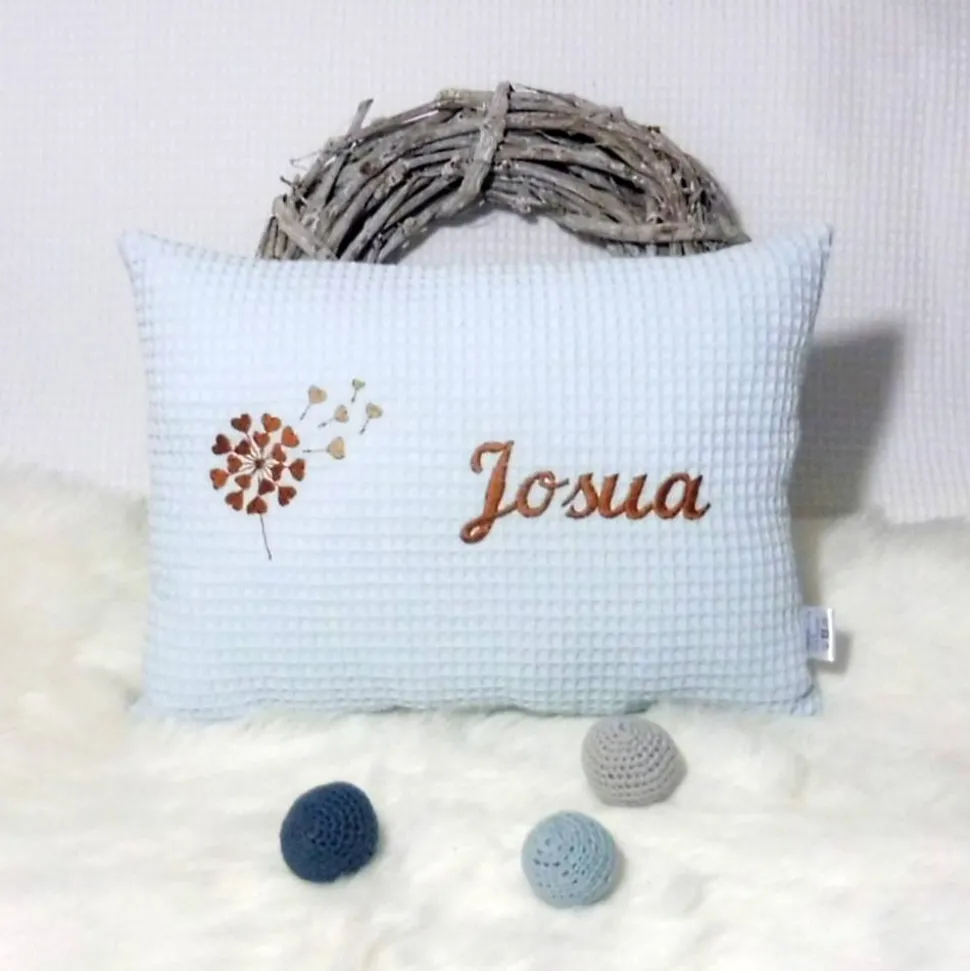 Dieses hochwertige Kissen wird mit dem Namen deines Lieblings und einer liebevollen Pusteblume bestickt – so entsteht ein unverwechselbares Unikat, das Eltern und Kind begeistert. Das weiche Kuschelkissen ist praktisch, langlebig und schenkt viele gemeinsame Glücksmomente beim Kuscheln, Spielen oder Vorlesen.