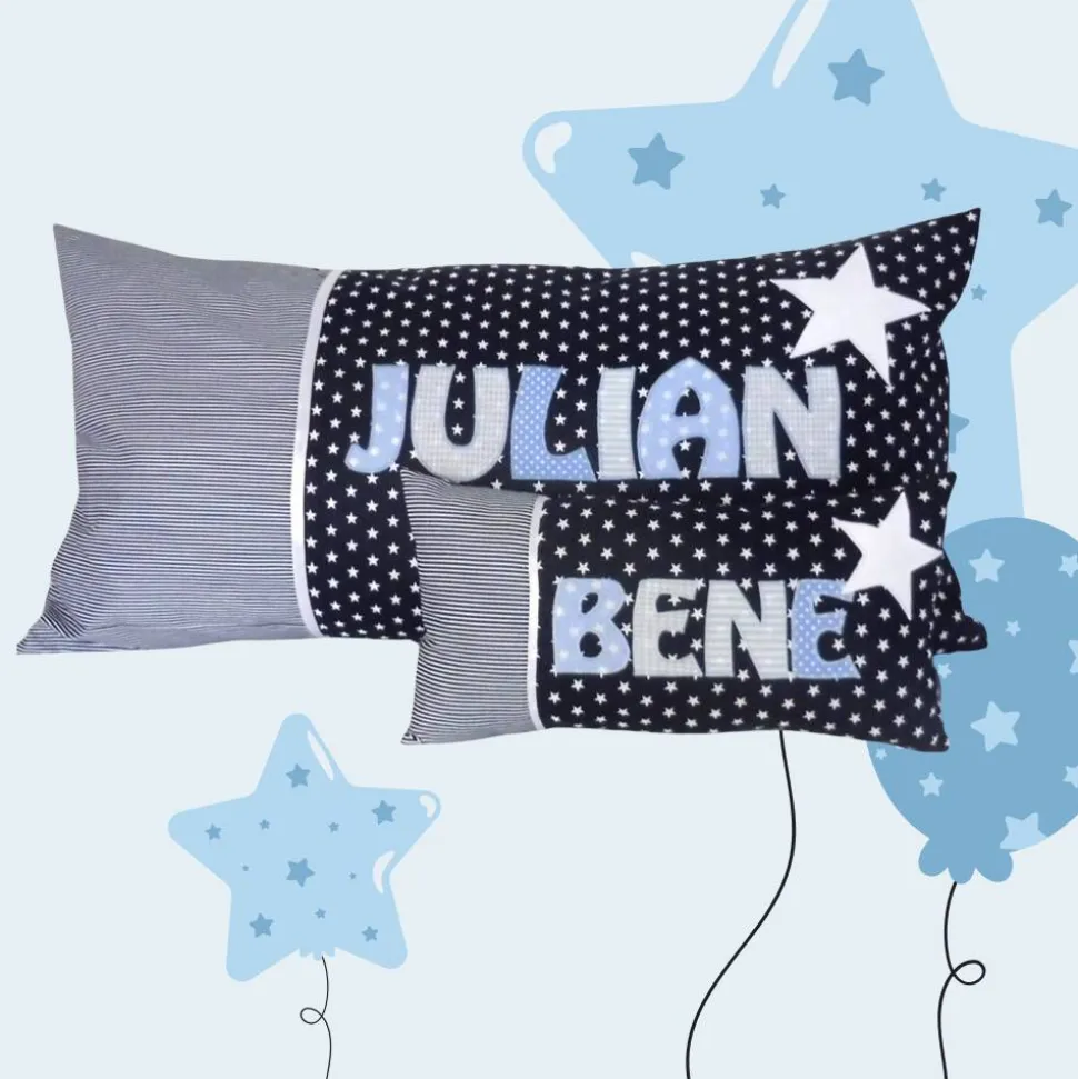 Auch der Kissenstoff kann angepasst werden – wähle zwischen grau/weiß, braun/weiß oder dunkelblau/weiß. Trage deinen Farbwunsch einfach im Personalisierungsfeld ein. Bei längeren Namen wird die Kissengröße entsprechend angepasst.