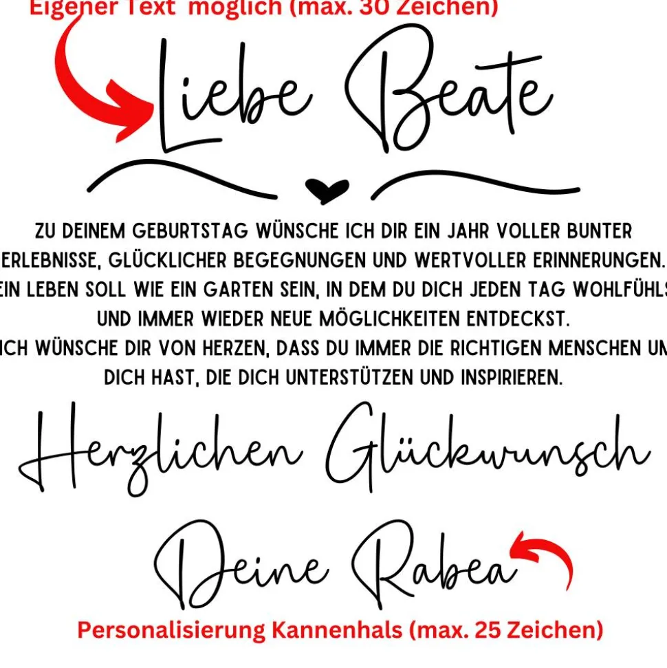 Je mehr Buchstaben umso kleiner wird die Schrift. – es wird zusätzlich eine dekorative Schleife befestigt ( das Aussehen der Schleife variiert nach unserem Lagerbestand und kann somit deutlich vom Bild abweichen ) – Der Text , der aus einem Vinylaufkleber besteht , befindet sich bei der Kanne immer auf der Seite , die keine Literskala hat.