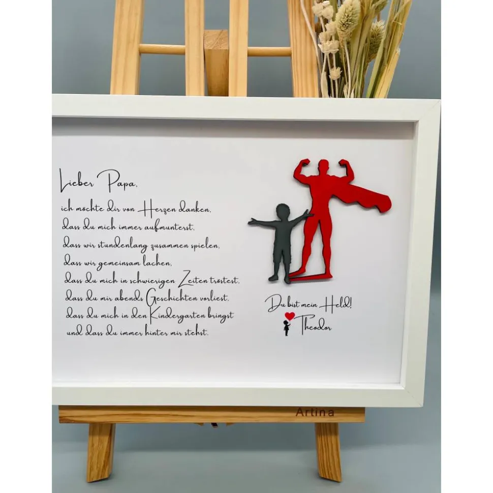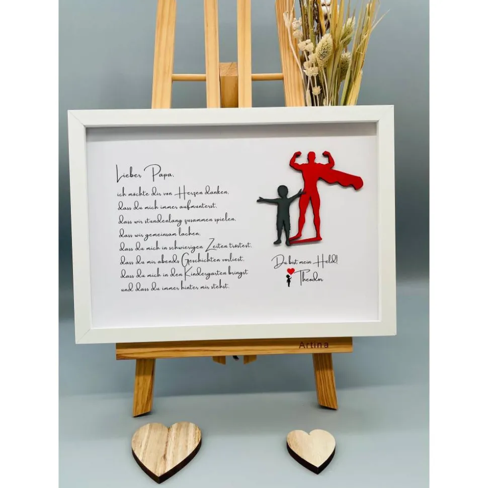 Bist du auf der Suche nach einem einmaligen Geschenk? Dann wirst du dieses Custom Bild lieben! Die Bilder sind echte Blickfänger und visuelle Highlights, die jedem Zimmer eine besondere Atmosphäre und den letzten Schliff verleihen. Die Materialien für das Bild werden aus Holz gelasert, per Hand lackiert und auf dem Bild angeordnet, was jedes Bild zu einem echten Unikat macht! Perfekt, um Papa eine besondere Freude zum Geburtstag oder Vatertag zu machen. Also, worauf wartest Du noch? Lass uns jetzt deine Personalisierungswünsche wissen und wir kreieren dein einmaliges Bild für dich!