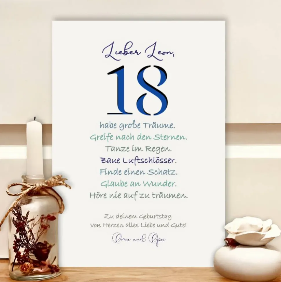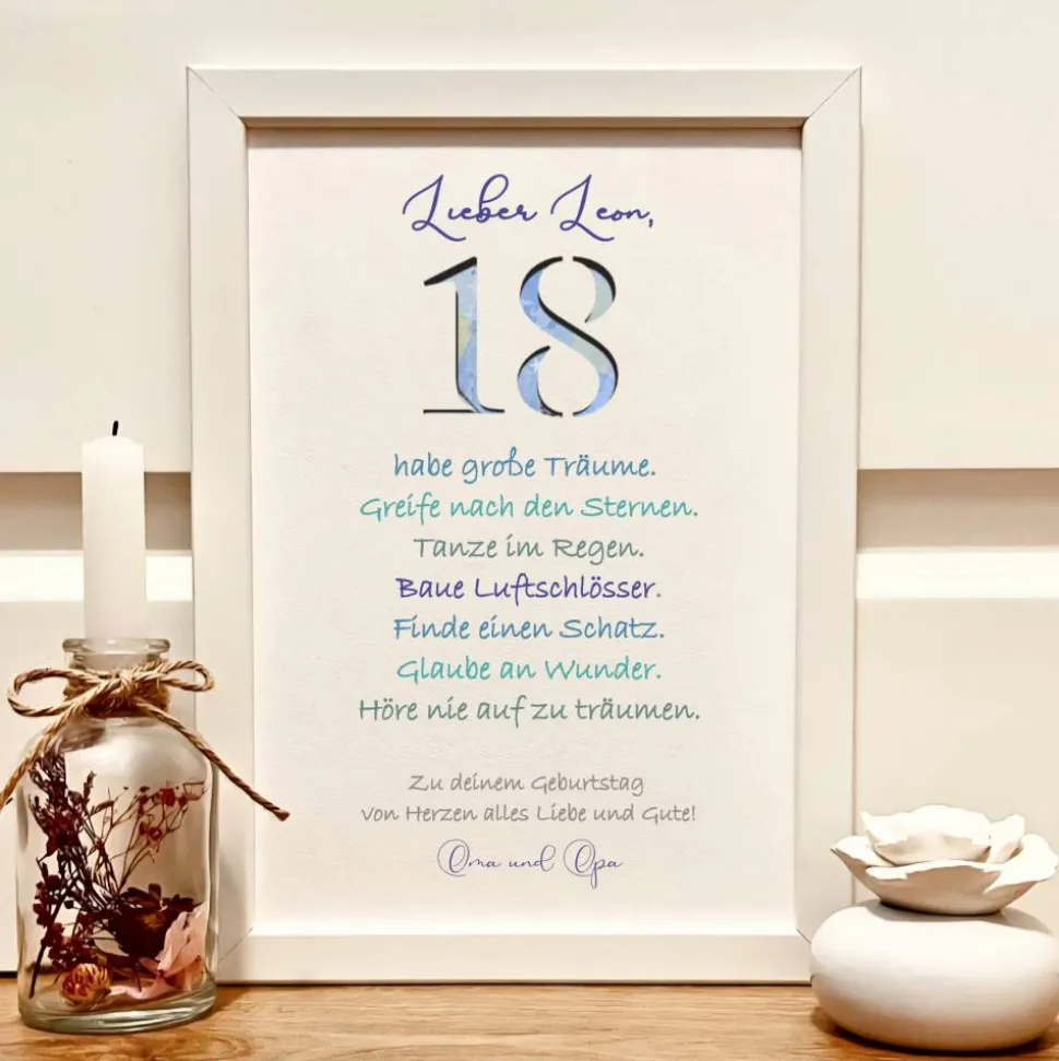 Das personalisierte Geschenk „Lebe deine Träume“ vereint Motivation, Stil und bleibende Erinnerungen in einem dekorativen Bilderrahmen. Genieße die perfekte Kombination aus praktischem Geldgeschenk und inspirierendem Erinnerungsstück – speziell für Jungen, die an diesem besonderen Tag groß feiern.