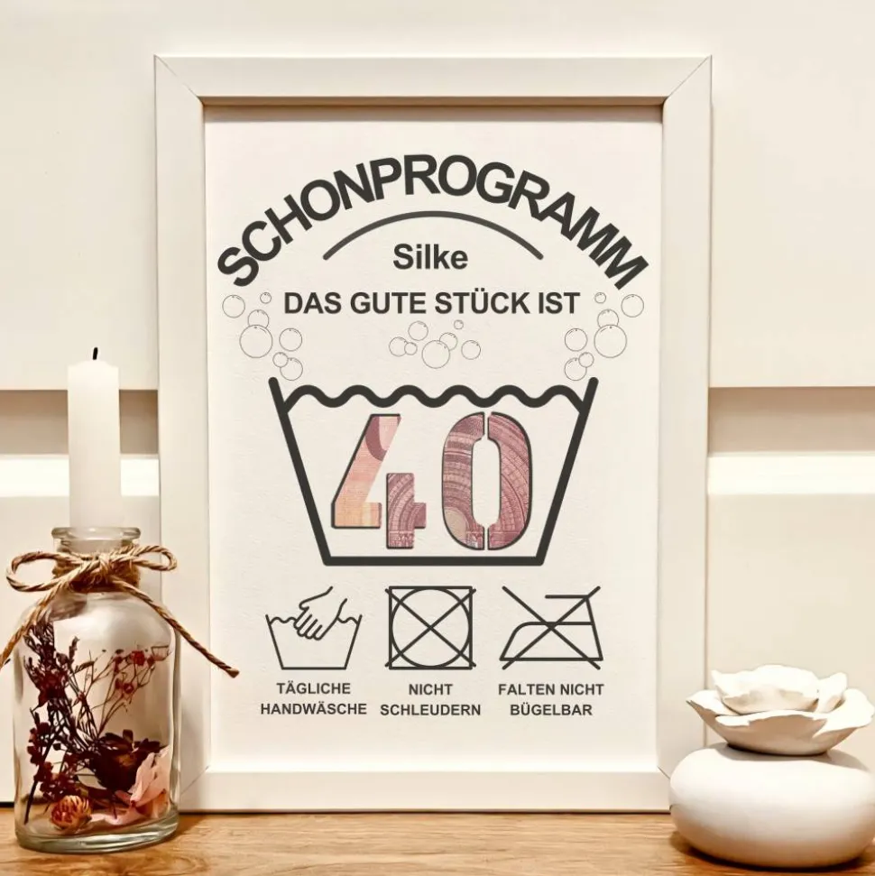 ergänzt durch witzige Pflege-Symbole wie Handwäsche, nicht schleudern, nicht bügeln. Das Highlight: Die große „40“ im Waschschüsselmotiv ist ausgeschnitten, sodass du Geldscheine dekorativ dahinter drapieren kannst. So wird aus einem einfachen Geldgeschenk ein echter Hingucker!
