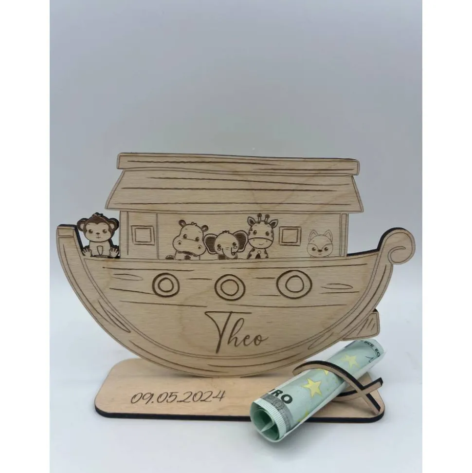 Verschenke ein einzigartiges, personalisiertes Geldgeschenk zur Taufe, Geburt oder zum Geburtstag: Unsere handgefertigte Arche Noah aus hochwertiger Birke ist nicht nur ein liebevolles Präsent, sondern auch ein bleibendes Erinnerungsstück für besondere Anlässe wie Kommunion und Konfirmation.