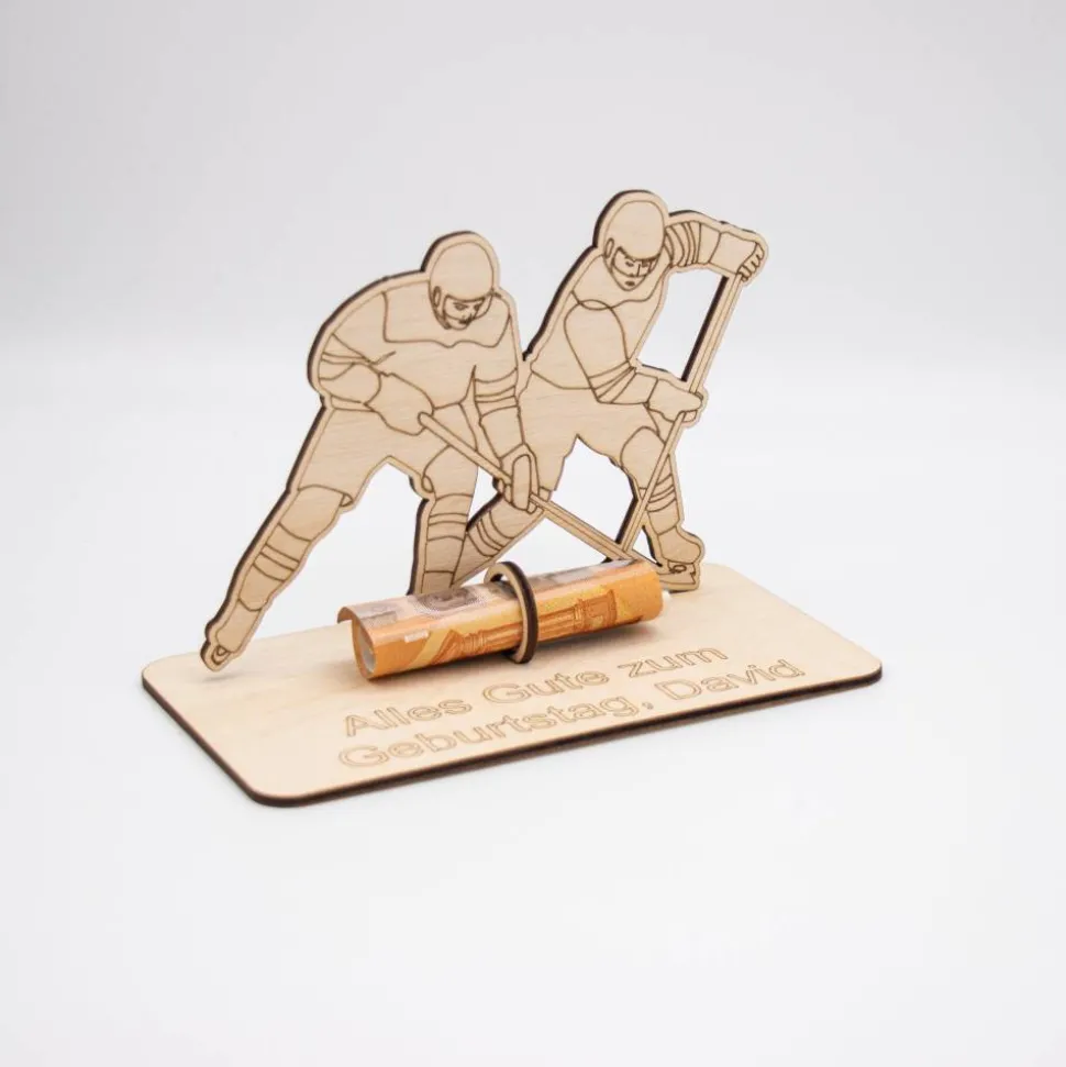 Dieses einzigartige Geschenk besteht aus mehreren präzise gelaserten Einzelteilen, die sich ganz einfach zusammenstecken oder kleben lassen – ein kleiner Bastelspaß inklusive! Das Motiv zeigt dynamische Eishockeyspieler in Aktion und macht dieses Geschenk zu einem echten Hingucker auf jedem Geburtstag, zur Jugendweihe, Konfirmation oder anderen Anlässen.