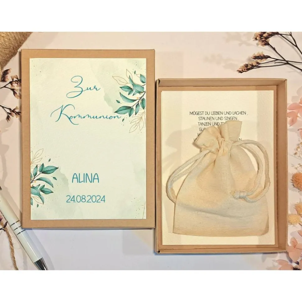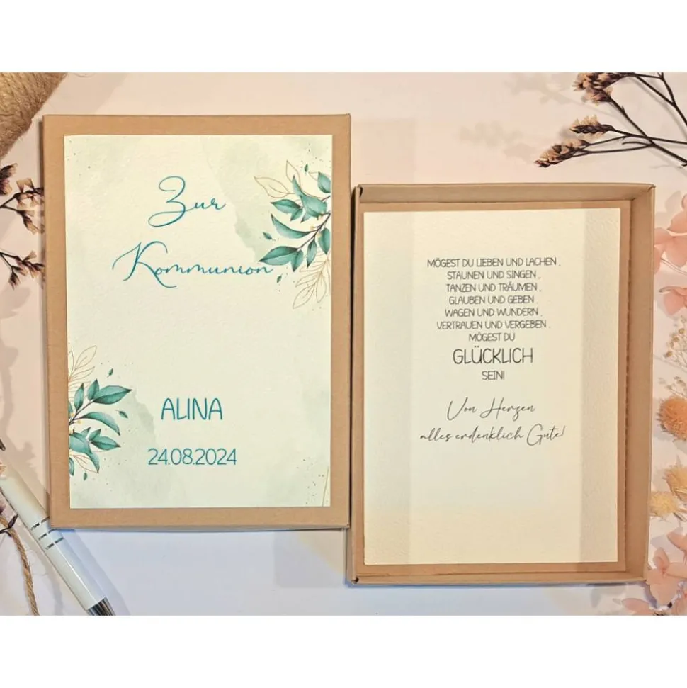 Diese liebevoll gestaltete Geschenkbox eignet sich ideal als Geldgeschenk zur Kommunion für Mädchen und Jungen. Die hochwertige Schachtel aus Kraftkarton wird individuell mit dem Namen des Kommunionskindes und dem Datum der Kommunion personalisiert und mit einem stilvollen Blätter-Motiv verziert.
