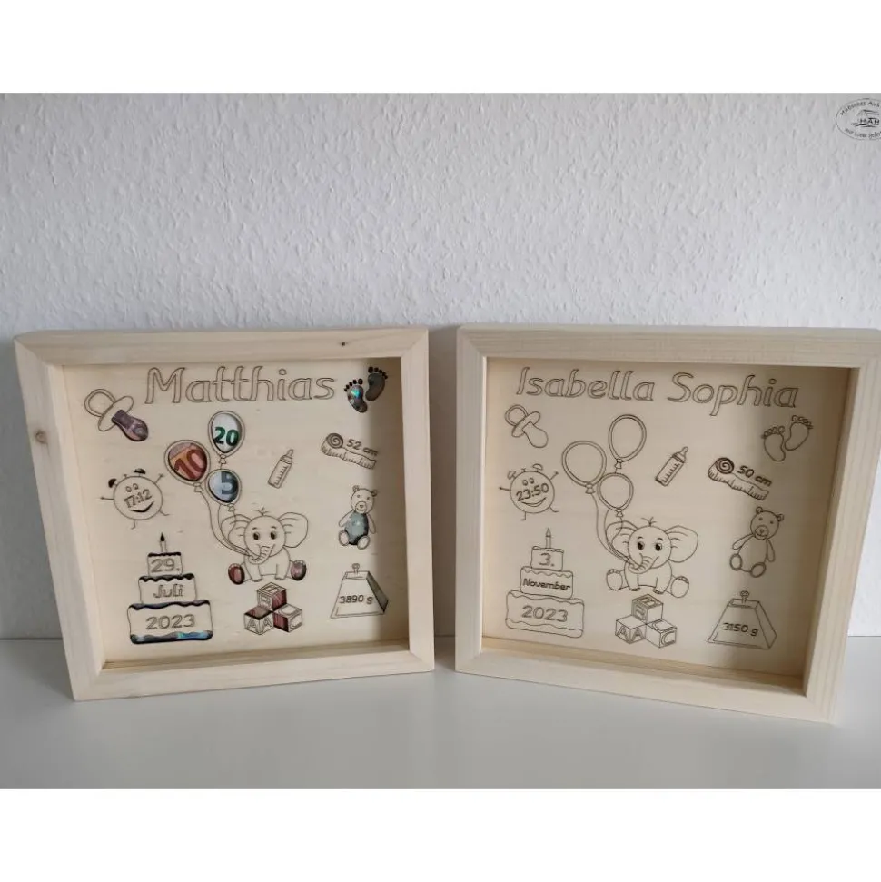 Der Bilderrahmen wurde in liebevoller Handarbeit aus Fichtenholz gefertigt. Das Inlay aus Pappelholz wird mit den Geburtsdaten des Kindes und den liebevoll entworfenen, abgebildeten Motiven graviert.
