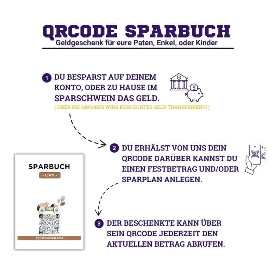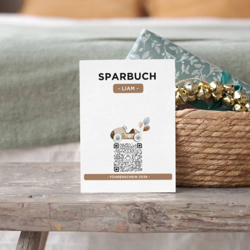 Personalisiertes Geldgeschenk | Virtuelles Sparbuch | QrCode Geschenkkarte | Auto Führerschein
