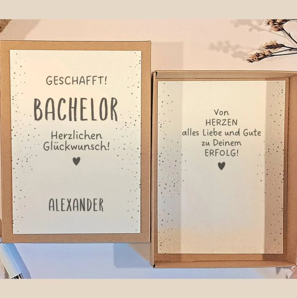 Mache deinem Absolventen eine unvergessliche Freude mit dieser personalisierten Geschenkbox zum Bachelor Abschluss! Die handgemachte Box aus stabilem Kraftkarton ist die ideale Wahl, um Geldgeschenke oder kleine Präsente liebevoll und stilvoll zu überreichen.