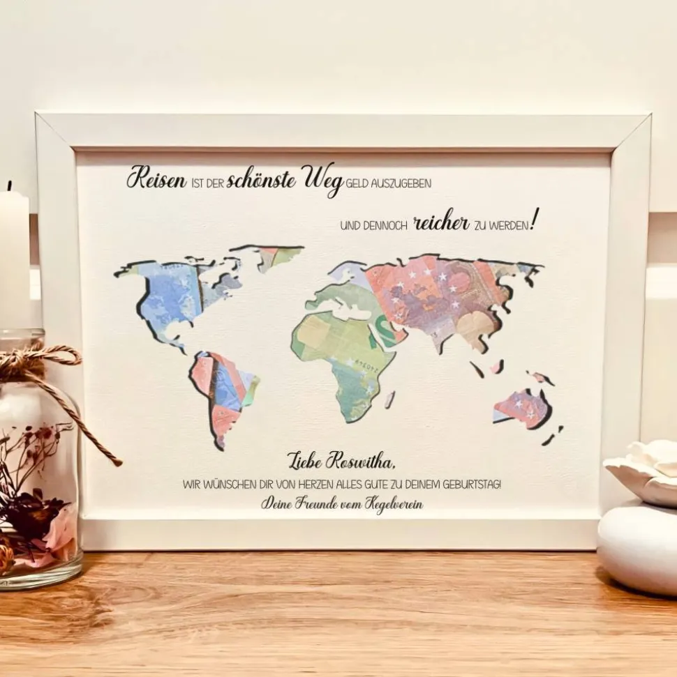 Originell und vielseitig: Verpacke das Geld hinter einer stilvollen Weltkarte und zaubere ein Lächeln ins Gesicht des Beschenkten. Das A4-Poster besteht aus hochwertigem 300g Karton mit edler Struktur. Ein mintgrünes Hintergrundpapier wird mitgeliefert, sodass der Rahmen auch ohne Geld ein echter Hingucker bleibt.