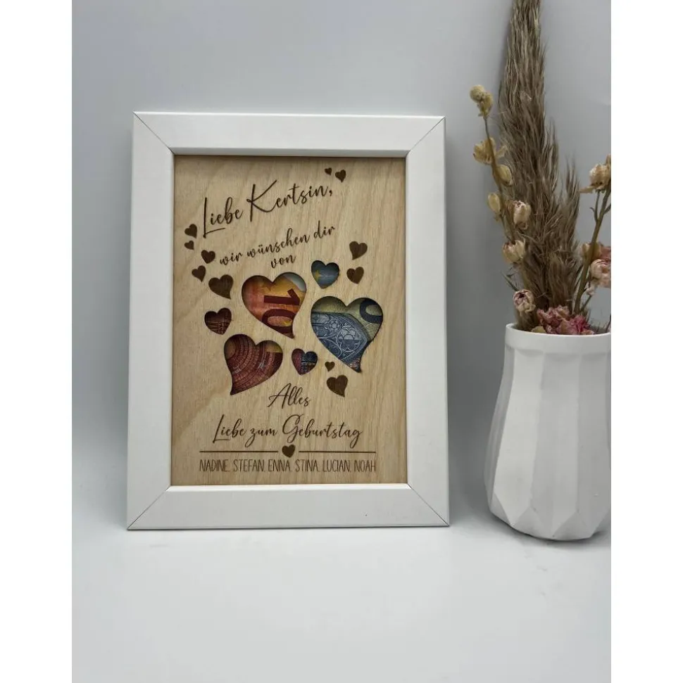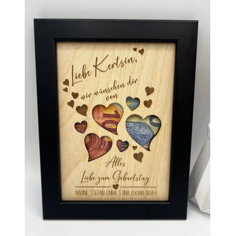 Verschenke Geld kreativ und persönlich! Mit unserem personalisierten Geldgeschenk im Bilderrahmen mit Herzmotiv hast du die perfekte Geschenkidee zum Geburtstag, Jubiläum oder jedem besonderen Anlass. Überrasche das Geburtstagskind mit einem stilvollen und individuellen Präsent, das von Herzen kommt.