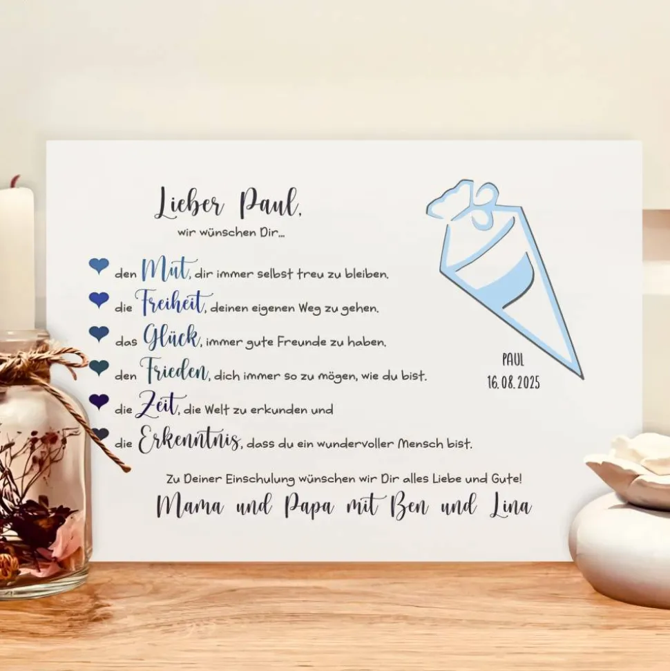Dieses personalisierte Geschenk vereint Erinnerungsstück und originelle Geldverpackung: Ein hochwertiger Bilderrahmen (Format: DIN A4 (21 × 29,7 cm)) mit Schultüten-Motiv und Ausschnitt für Geldschein(e), liebevoll bedruckt mit Name und Einschulungsdatum. Optional kannst du auch den Namen der Gratulanten (z. B. Mama, Papa, Oma, Opa) hinzufügen und so das Geschenk noch persönlicher gestalten.