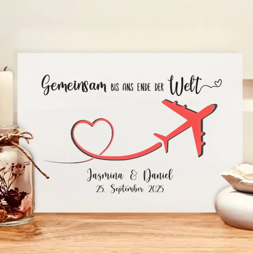 Mache den Hochzeitstag unvergesslich und schenke ein personalisiertes Geschenk, das Reisen, Träume und Liebe vereint. Perfekt für Flitterwochen oder als Symbol für eine gemeinsame Zukunft!