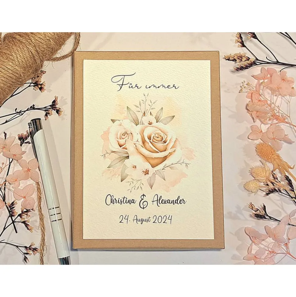 Im Inneren findest du eine liebevoll gestaltete Glückwunschkarte für persönliche Worte und ein Baumwollsäckchen zum stilvollen Überreichen von Geld oder kleinen Geschenken. Mit ihrem romantischen Charme zauberst du garantiert ein Lächeln auf das Gesicht des Brautpaares.