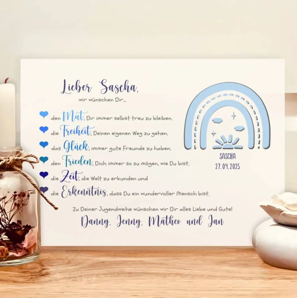 Individuell nach deinen Wünschen gestaltet: Personalisiere das Geschenkbild mit dem Namen des Jugendlichen, auf Wunsch mit Datum der Jugendweihe und den Namen der Gratulanten. So entsteht ein echtes Unikat, das in Erinnerung bleibt.