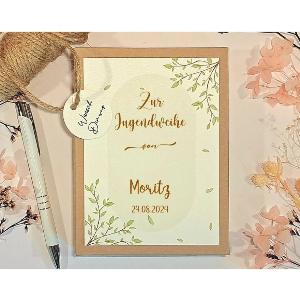 Edles Design & individuelle Personalisierung: Die Geschenkbox wird mit einem eleganten Blätter-Motiv verziert und individuell mit dem Namen des Jugendlichen gestaltet. So wird dein Geschenk garantiert zum Hingucker auf jeder Jugendweihe.