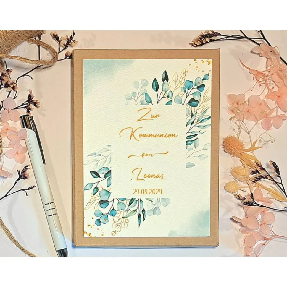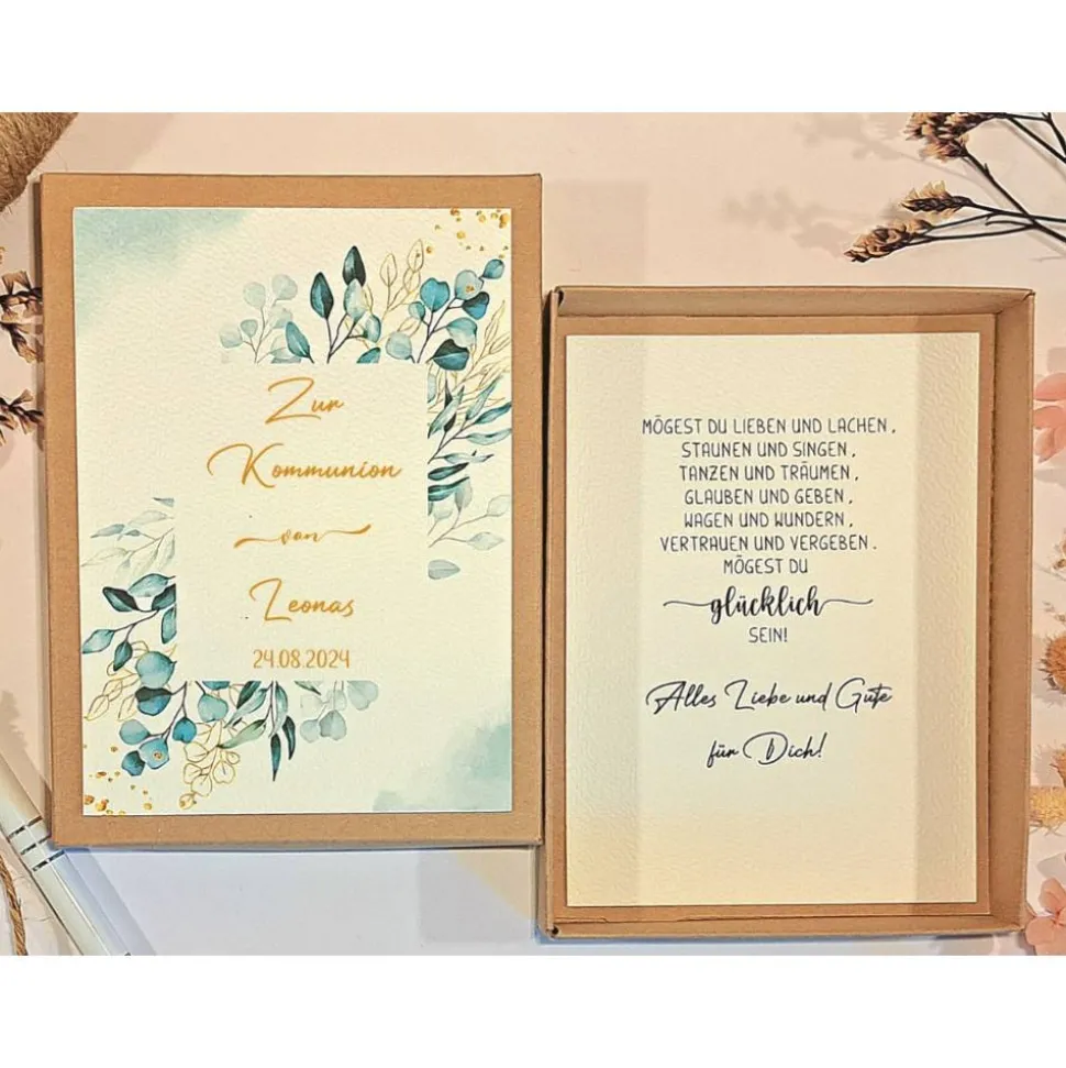 Die hochwertige Schachtel besteht aus robustem Kraftkarton und wird mit einem stilvollen Blätter-Design verziert. Die Box wird individuell mit dem Namen des Kommunionskindes und dem Datum der Kommunion personalisiert und macht dein Geschenk zum echten Highlight.