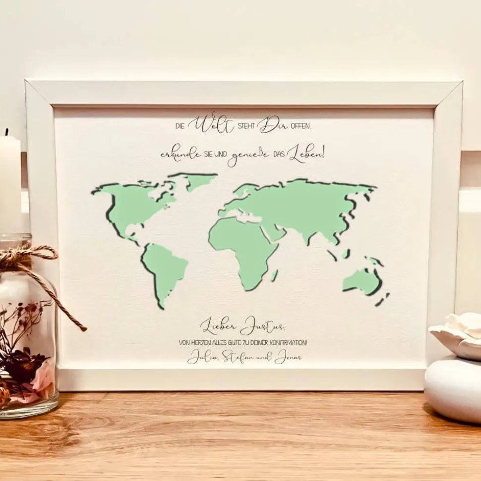 Du suchst nach einem besonderen Geschenk zur Konfirmation, das für Jungen und Mädchen gleichermaßen passt? Unser Geldgeschenkbild im A4-Format ist die ideale Wahl – liebevoll gestaltet mit einem modernen Weltkarten-Design. Damit verschenkst du nicht nur Geld, sondern auch eine bleibende Erinnerung und stilvolle Wohndeko für den Konfirmanden.