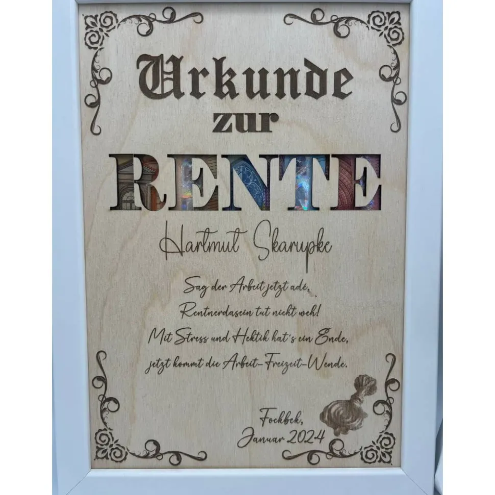 Mache den Ruhestand unvergesslich mit einer persönlichen Note – dieses Geldgeschenk zur Rente im Bilderrahmen ist einmalig und individuell für dich gefertigt!