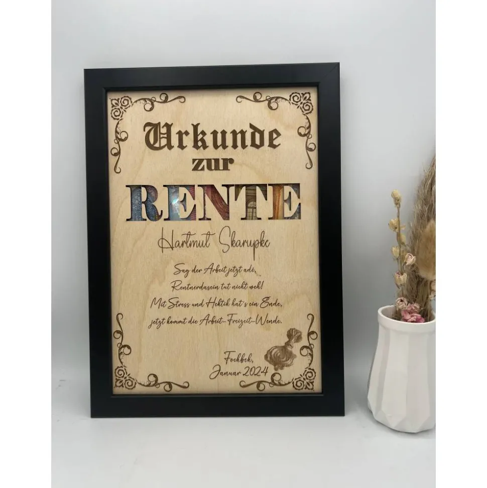 Überrasche einen lieben Menschen zum Ruhestand mit einem einzigartigen, personalisierten Geldgeschenk! Diese besondere Urkunde im hochwertigen Bilderrahmen ist die perfekte Geschenkidee, um den Start in den Ruhestand gebührend zu feiern. Die Kombination aus edlem Bilderrahmen und einer eingelegten 3mm starken Holzdekorplatte macht dieses Geschenk zu einem echten Blickfang und einer bleibenden Erinnerung an die Arbeitszeit.