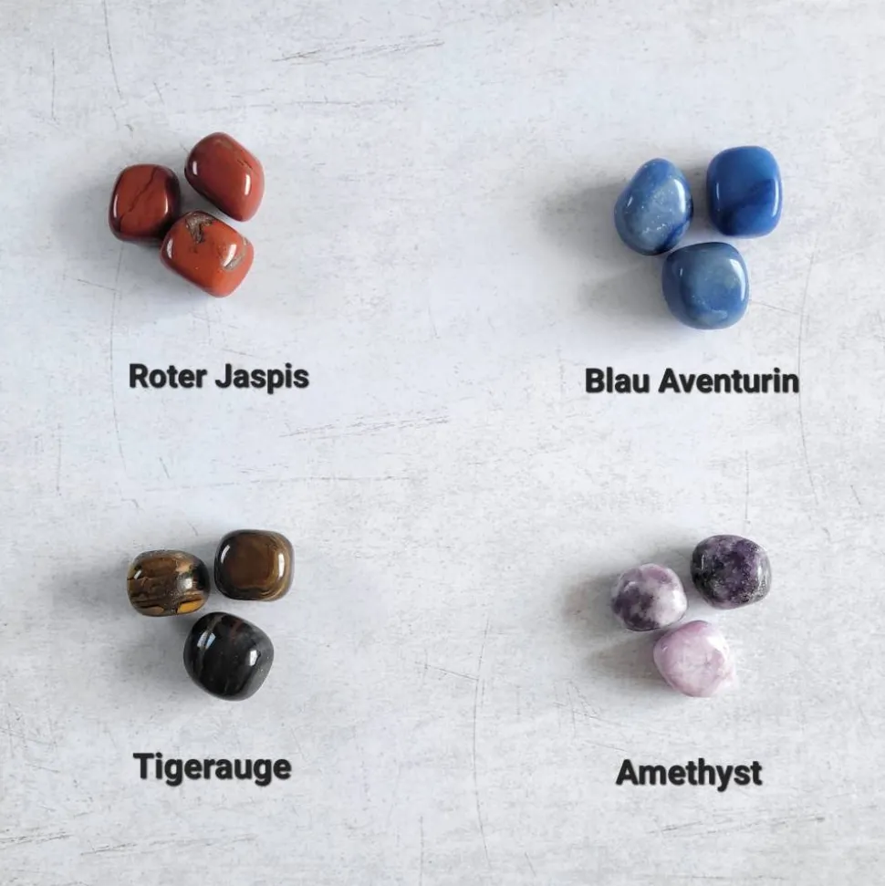 * Der Mutstein: Jede Box enthält einen echten Trommelstein, zum Beispiel: