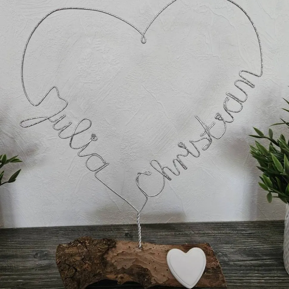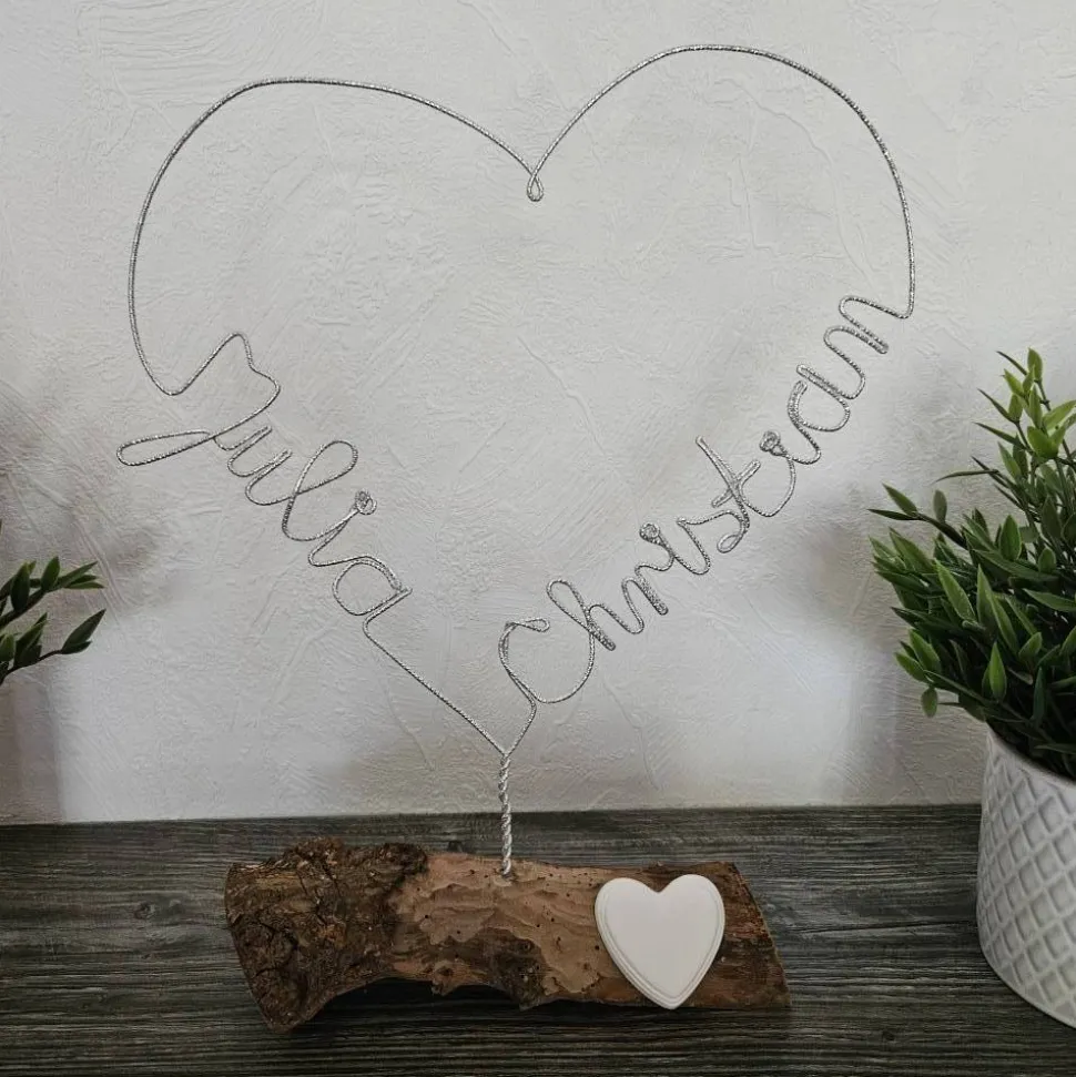 Auf Bestellung fertige ich ihnen ein peronalisiertes Herz, wie auf den Beispielbildern, gerne an. Das Herz ist aus Diamant-Glitzer-geprägtem Aluminiumdraht gefertigt. Es wird auf einem massiven Holzstück befestigt. Das Holz sieht immer anders aus. Ein Keramikherz dient zusätzlich als schöne Dekoration, welches von mir auf das Holz geklebt wird. Insgesamt hat dieses schöne Geschenk eine Gesamthöhe von 33 – 36 cm. Das Herz selbst hat eine Breite von 25 – 27 cm und eine Höhe von 26-28cm.