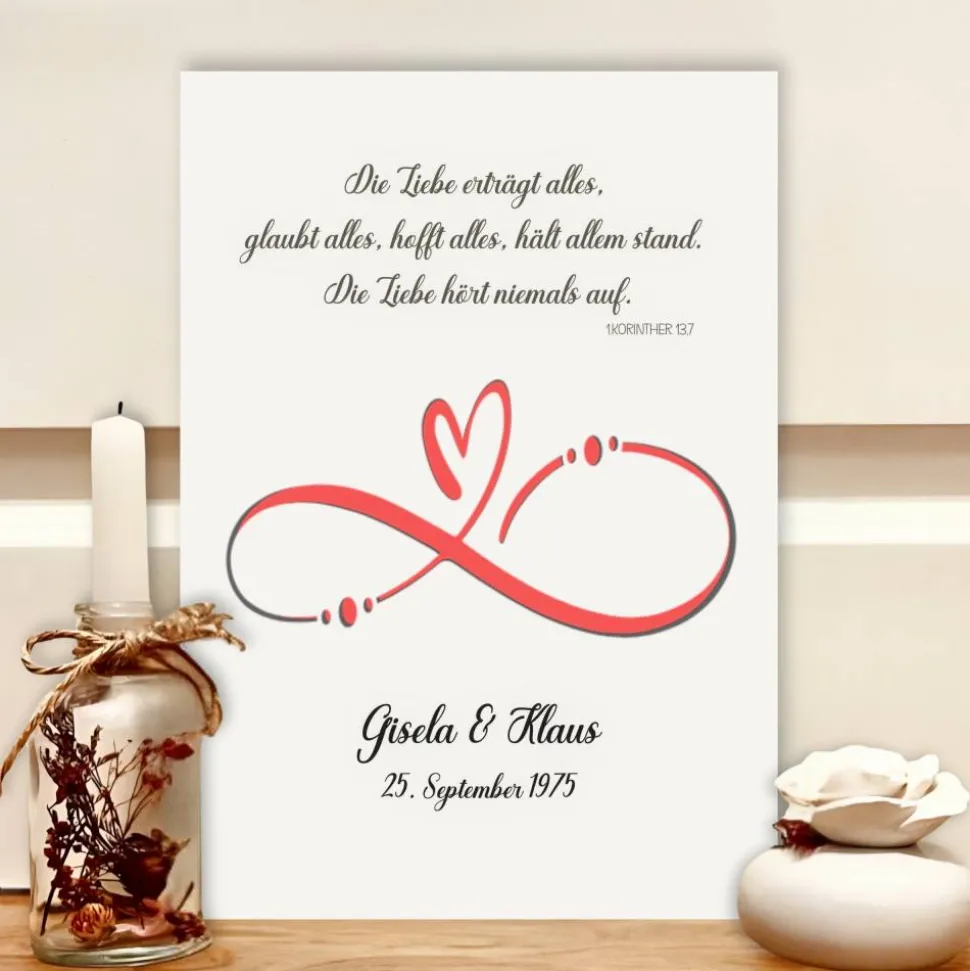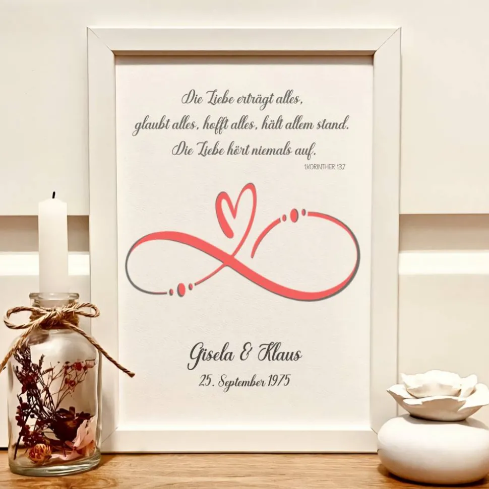 Entdecke das perfekte personalisierte Hochzeitsgeschenk: Unser Geldgeschenk im A4-Bilderrahmen mit dem besonderen Spruch aus 1. Korinther 13,7 vereint Emotion, Kreativität und bleibende Erinnerung.