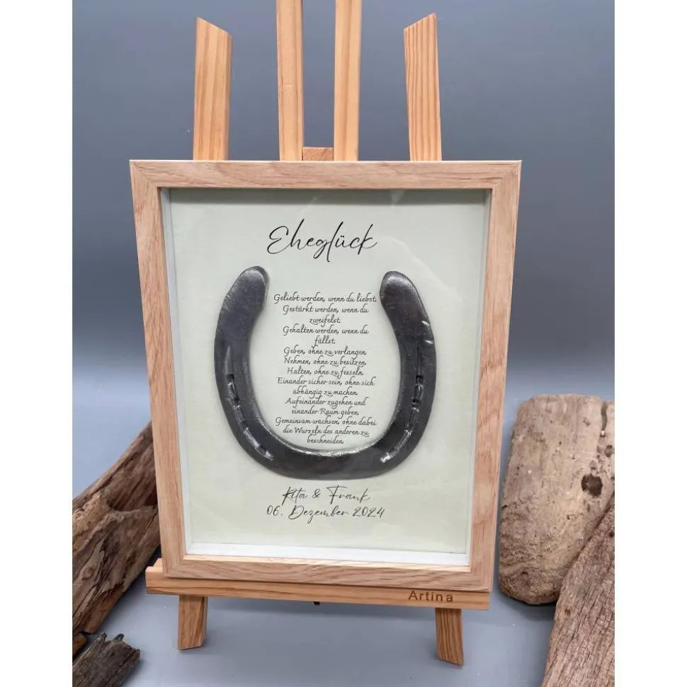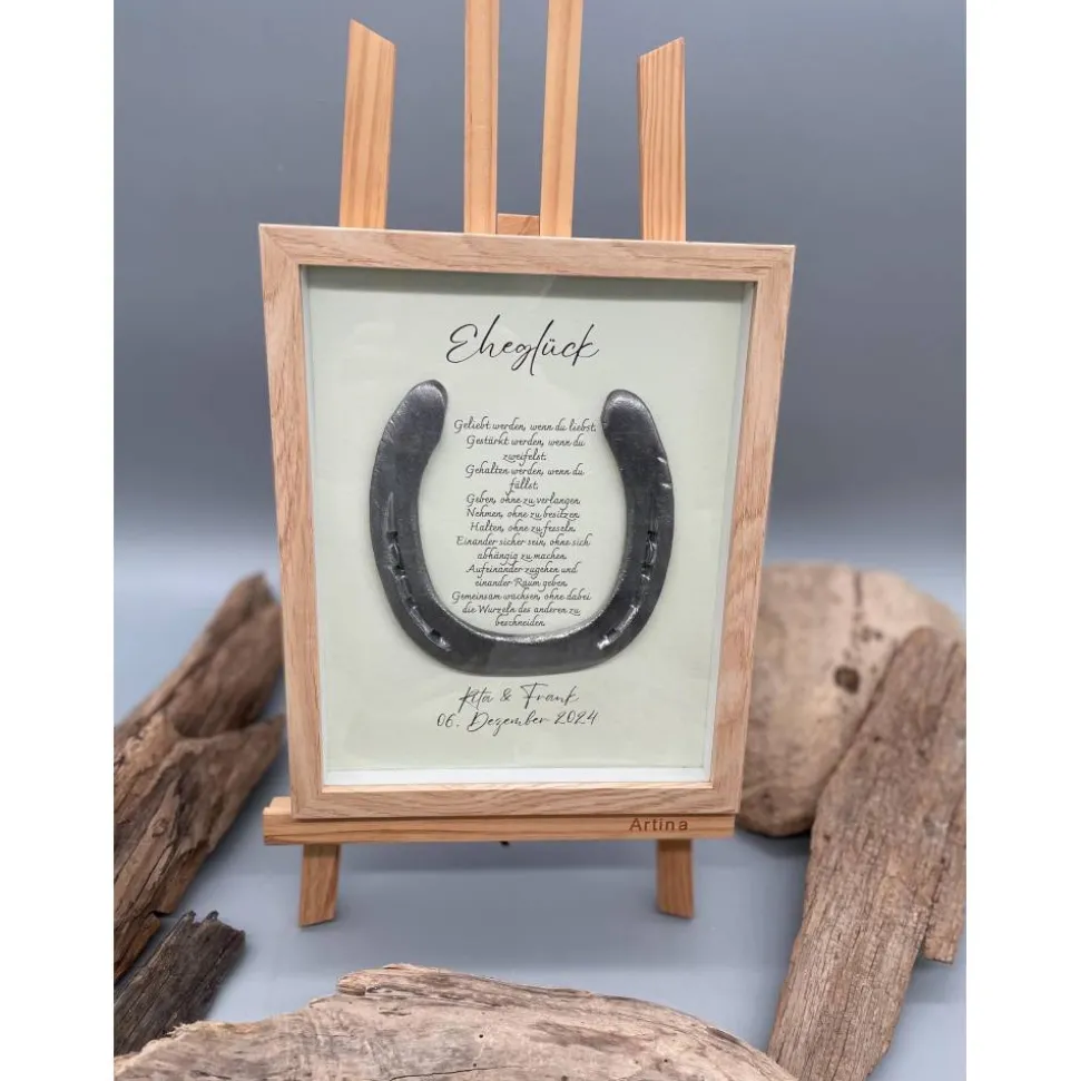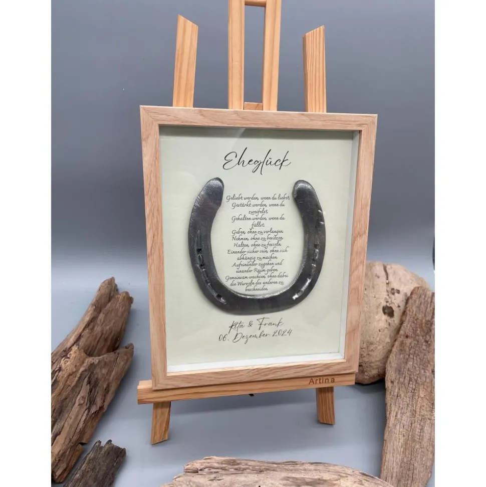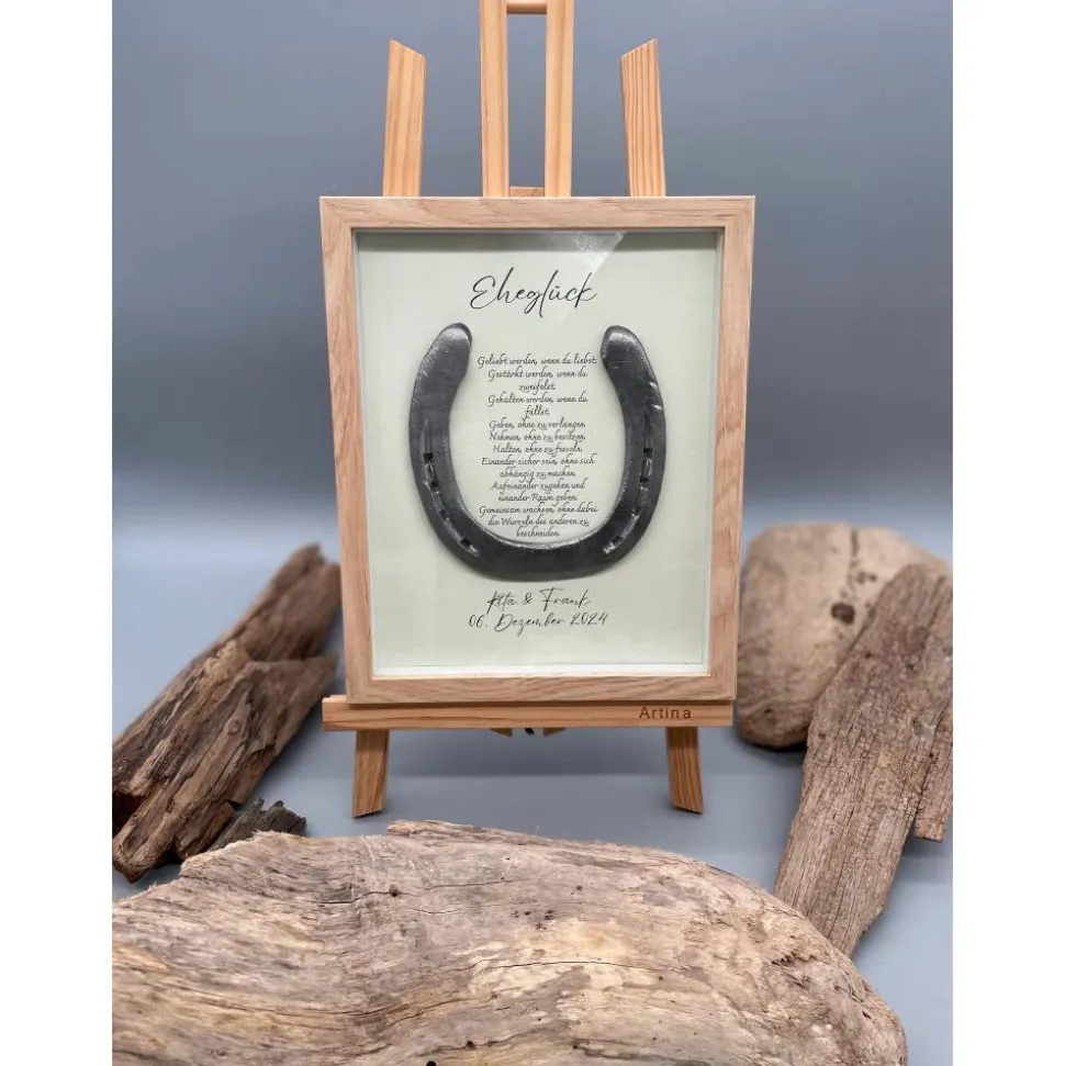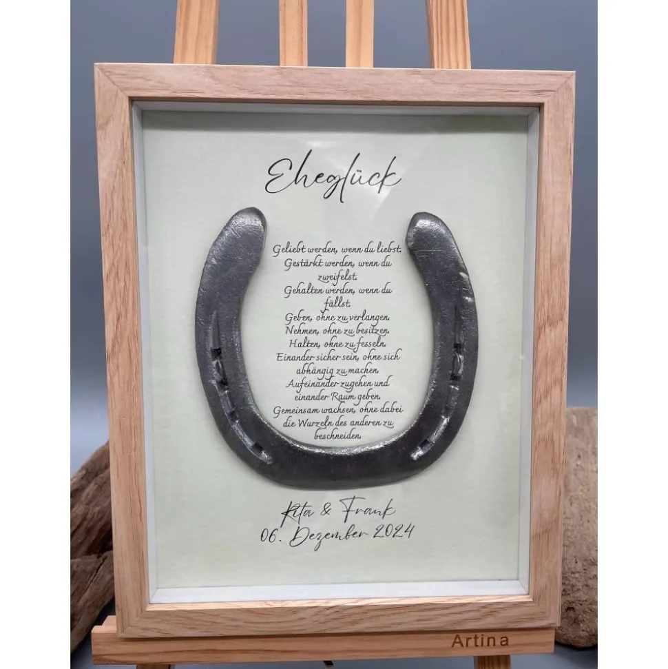 Bist du auf der Suche nach einem außergewöhnlichen und liebevoll handgefertigten Hochzeitsgeschenk? Dieses personalisierte Wandbild mit einem echten getragenen Hufeisen ist der perfekte Glücksbringer für das frisch vermählte Paar. Das Hufeisen gilt seit jeher als Symbol für Glück und Liebe – verewigt in einem stilvollen Bilderrahmen, wird es zum Highlight in jedem Zuhause.