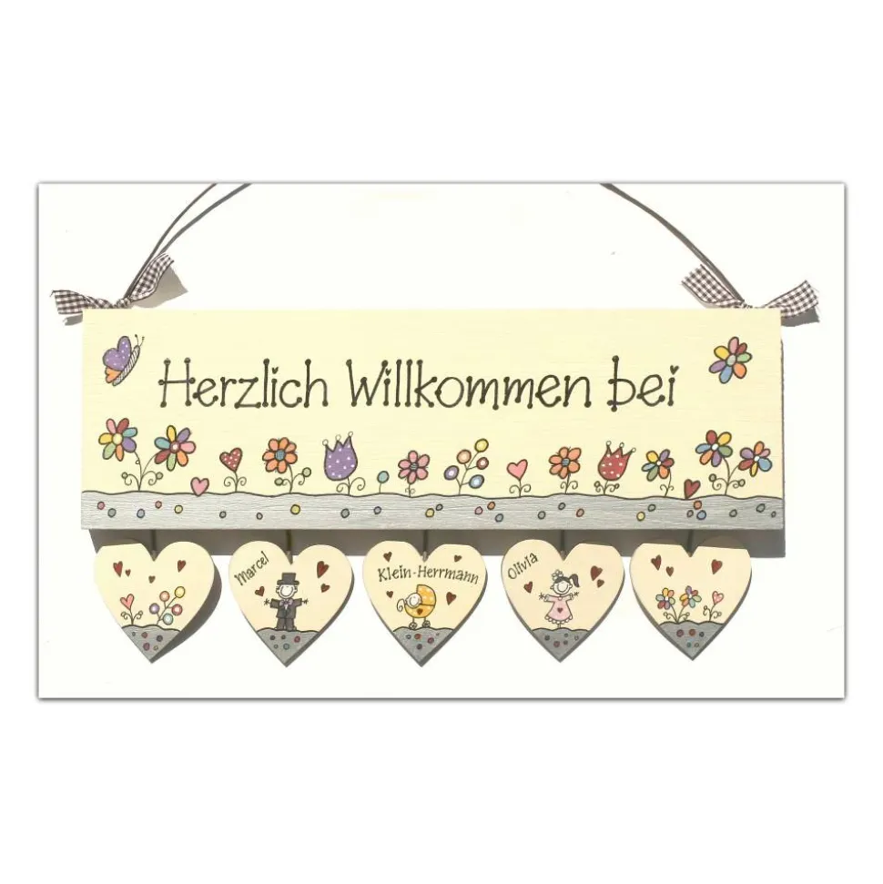 Verschenke ein personalisiertes Hochzeitsgeschenk, das begeistert! Dieses wunderschöne Willkommensschild aus Holz mit Herzanhänger ist ein echter Blickfang an jeder Haustür. Das Türschild für die Familie wird handbemalt und handbeschriftet – jedes Stück ist ein Unikat und wird liebevoll auf deinen Wunsch angefertigt.