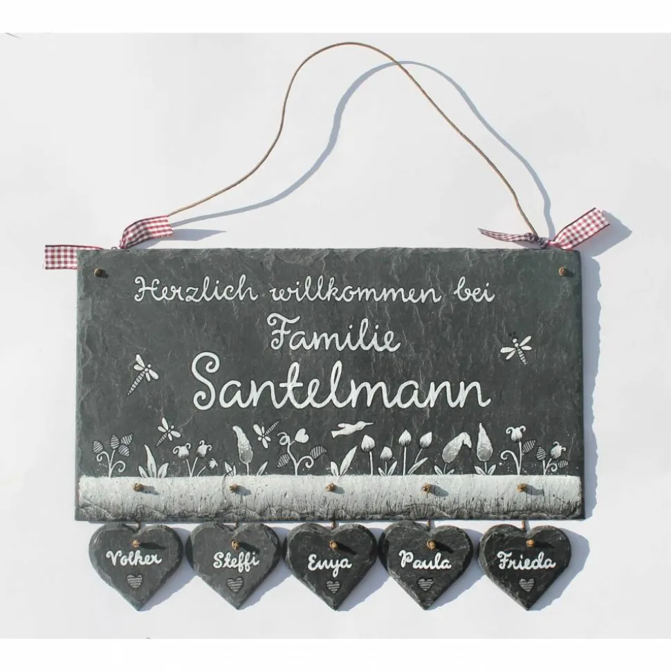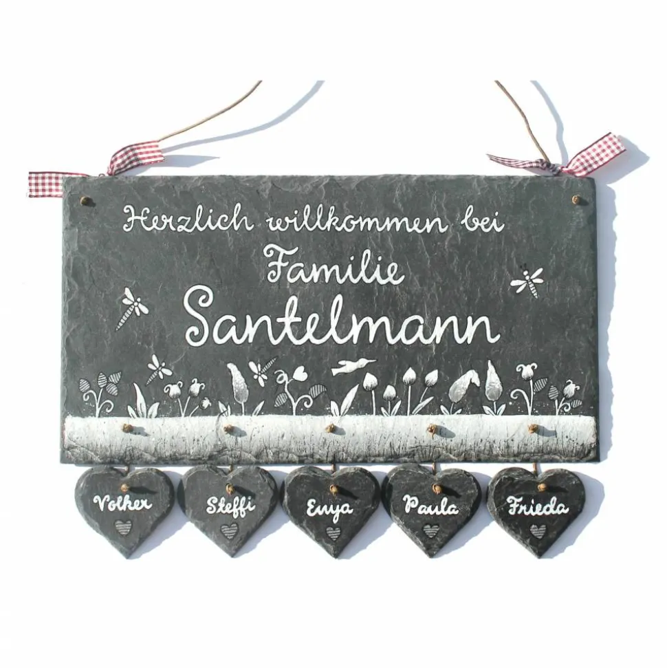 Gestalte jetzt dein exklusives Schiefertürschild mit individueller Bemalung, Wunschtext, Wunschschriftart und bis zu 6 Herzanhängern. Lieferung inklusive Aufhängekordel.