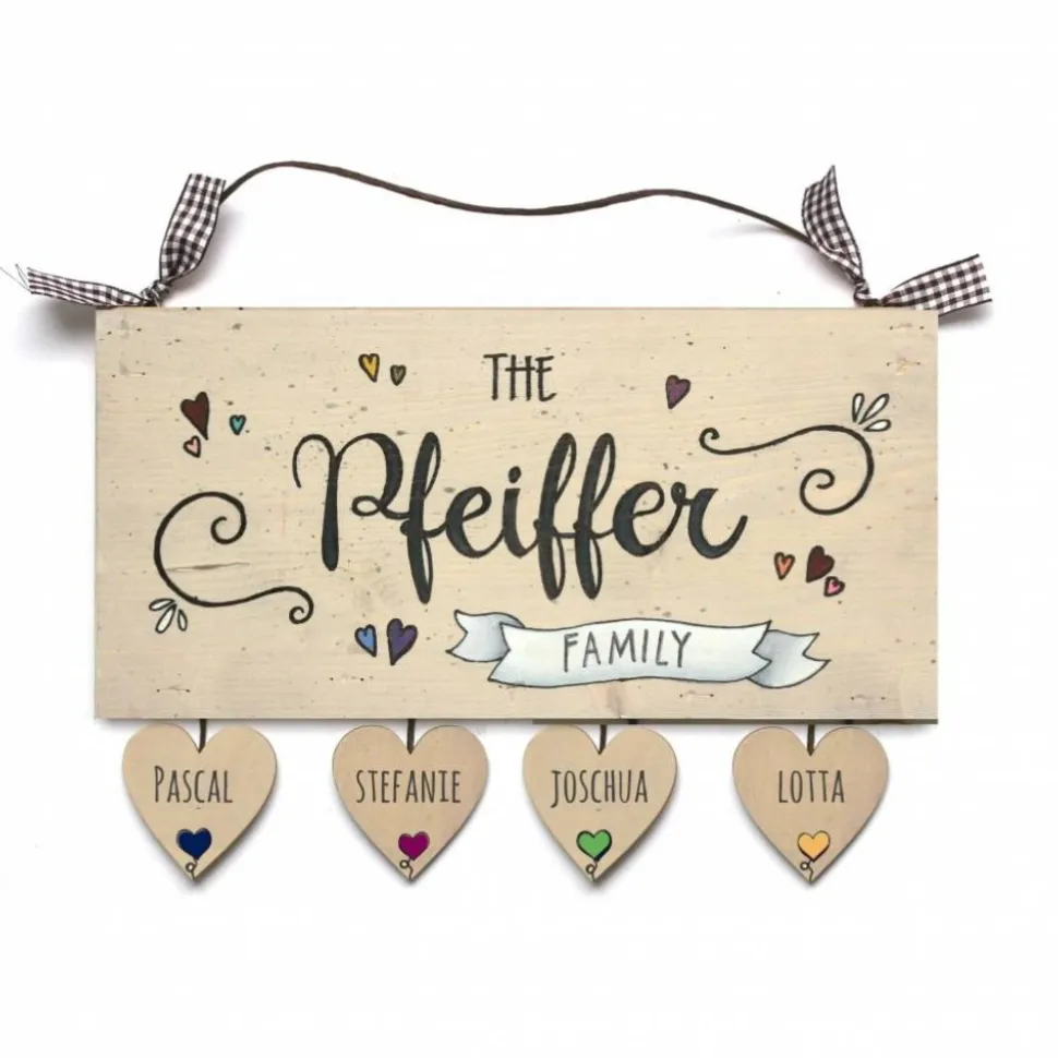 Gestalte Dein eigenes Willkommensschild: Gib einfach Deinen Familiennamen und die Vornamen der Familienmitglieder an. Das Schild wird individuell mit „THE Wunschname FAMILY“ beschriftet und mit Herzen und Banner verschönert. Die Bemalung und Beschriftung ist mit hochwertigem, mattem Klarlack versiegelt und dadurch optimal vor Witterungseinflüssen geschützt.
