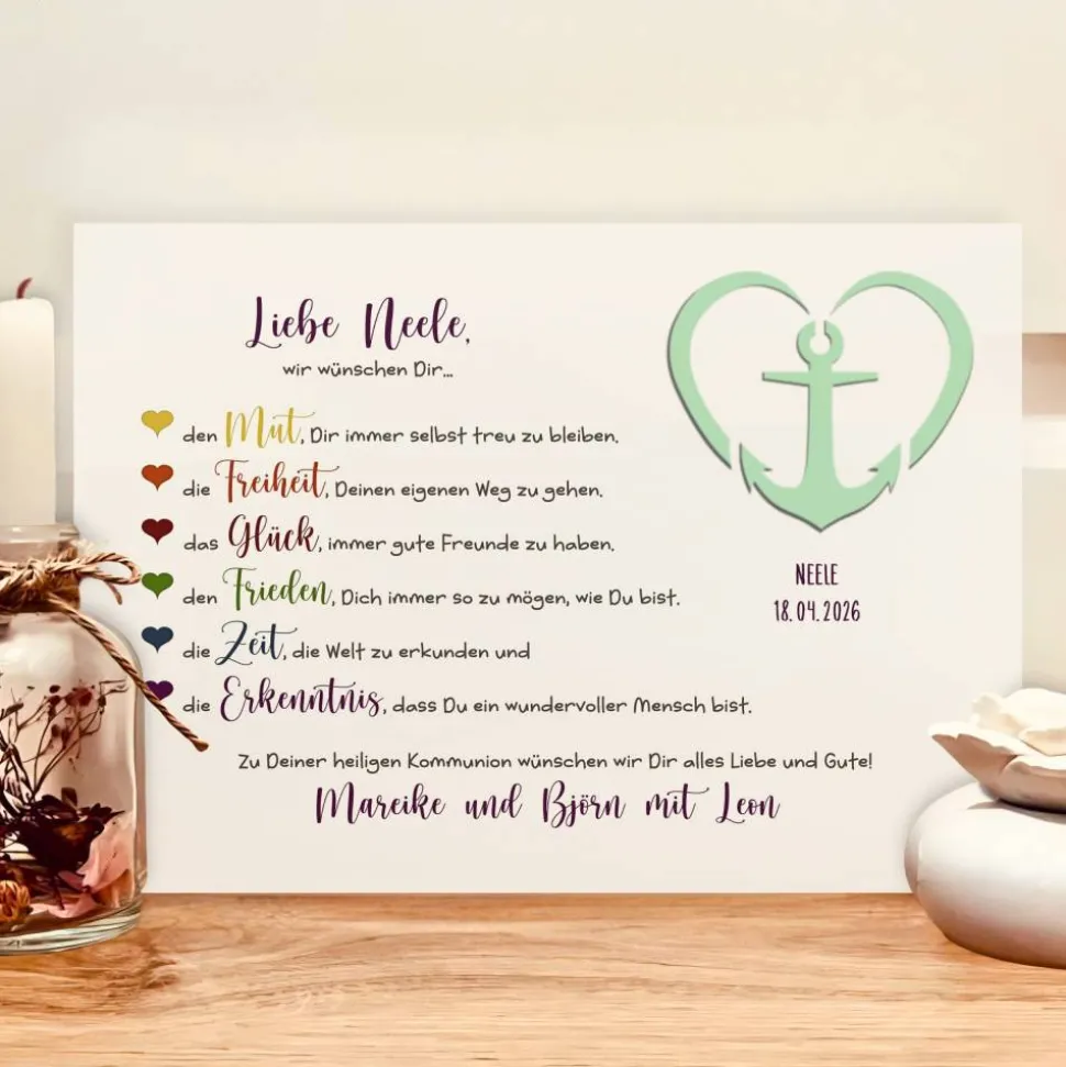 Deine individuelle Note: Du bestimmst den Namen des Kommunionkindes, das Datum der Erstkommunion und auf Wunsch die Namen der Schenkenden. Jedes Bild wird speziell für dich nach deinen Vorgaben gestaltet und optional im weißen DIN A4 Rahmen (21 × 29,7 cm) geliefert.