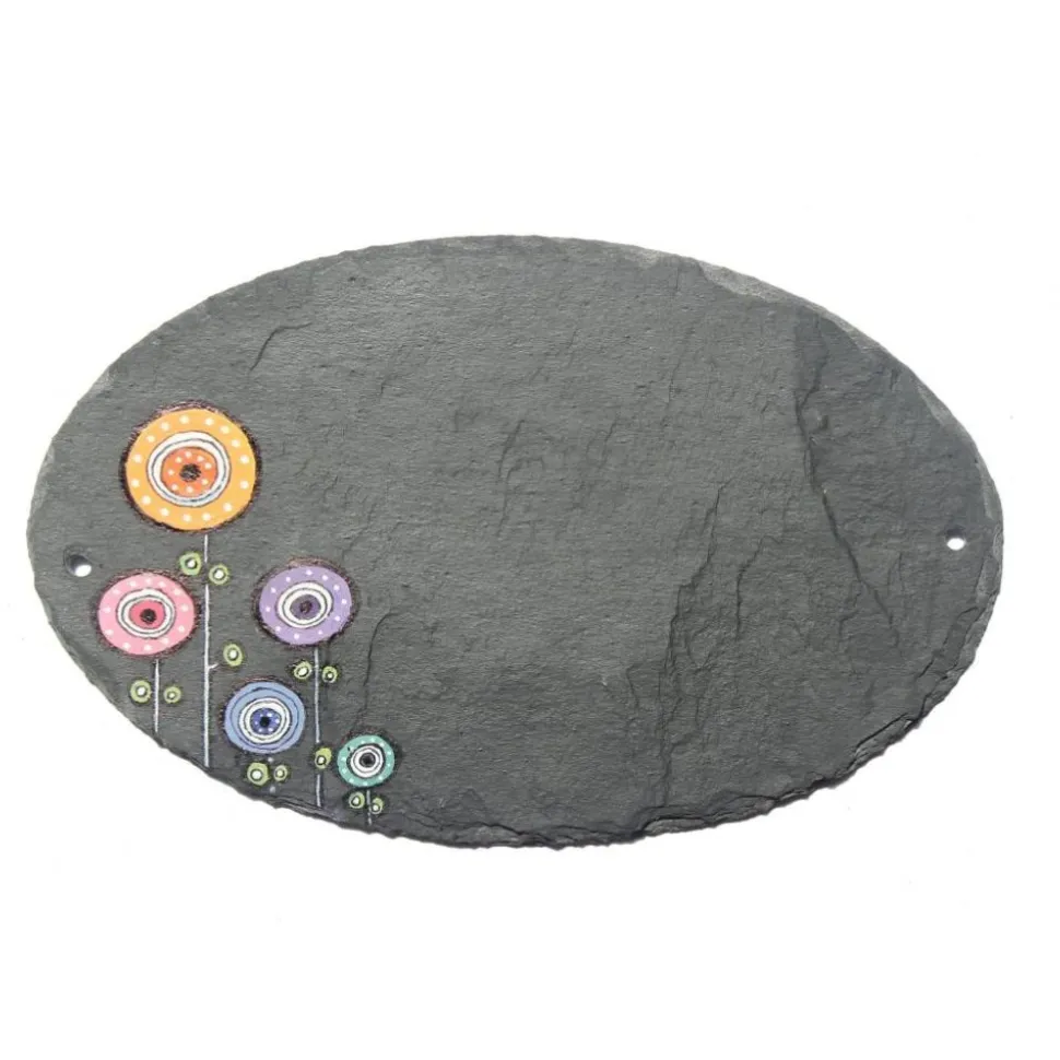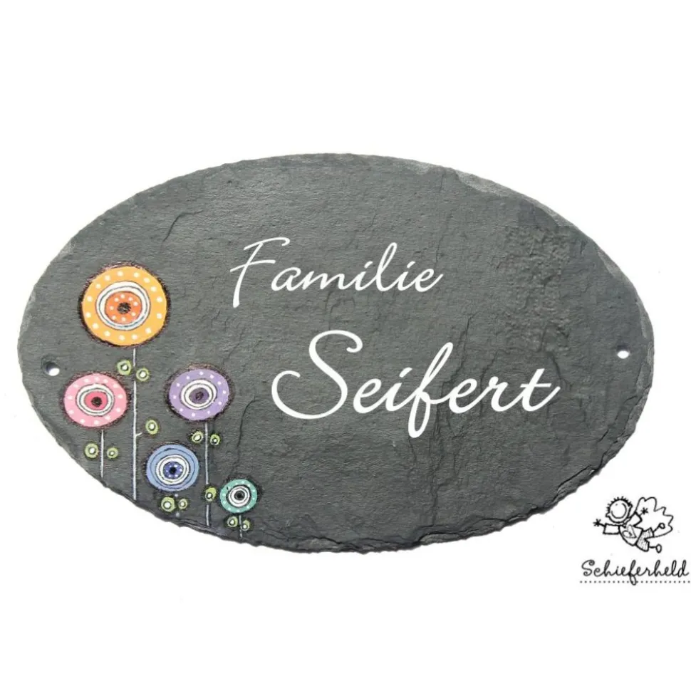 Setze ein stilvolles Statement an deiner Haustür mit dem einzigartigen ovalen Schieferschild für Familien. Jedes Türschild wird aus hochwertigem Naturschiefer handgefertigt und individuell mit deinem Familiennamen personalisiert. Die handbemalten Retroblumen machen das Schild zu einem exklusiven Hingucker.