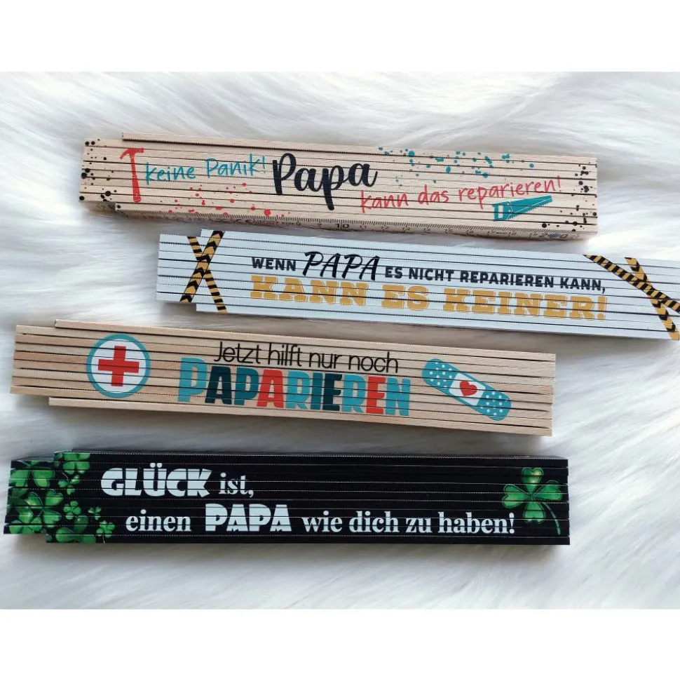 Lieferumfang: Ein 2m Zollstock in deiner Wunschfarbe mit individuellem Aufdruck (Motiv 1/2/3/4) und Name nach Wahl. Teile einfach Papa, Opa, Fritz oder deinen Wunschnamen mit.