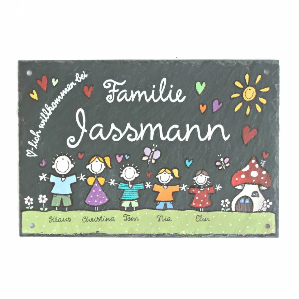 Setze ein stilvolles Statement an deiner Haustür mit diesem exklusiven Türschild aus Naturschiefer, das du individuell mit deinem Familiennamen und Wunschfiguren personalisieren kannst. Das handgefertigte Schild überzeugt durch hochwertige Verarbeitung, detailverliebte Bemalung und ein einzigartiges Design – ein echtes Unikat für deinen Eingangsbereich.
