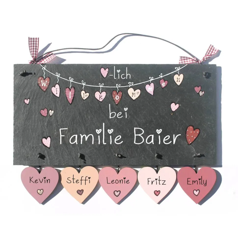 Das handgefertigte Namensschild überzeugt durch edles Design und viel Liebe zum Detail. Der Schiefer wird mit speziellem Schieferöl behandelt und mit langlebigen, umweltfreundlichen Farben bemalt – so bleibt dein Türschild auch bei Sonne oder Regen wunderschön. Die Beschriftung ‚-lich willkommen‘ und die farbenfrohe Herzkette machen das Schild zu einem echten Blickfang. Darunter steht ‚bei Familie‘ mit deinem Wunschnamen.