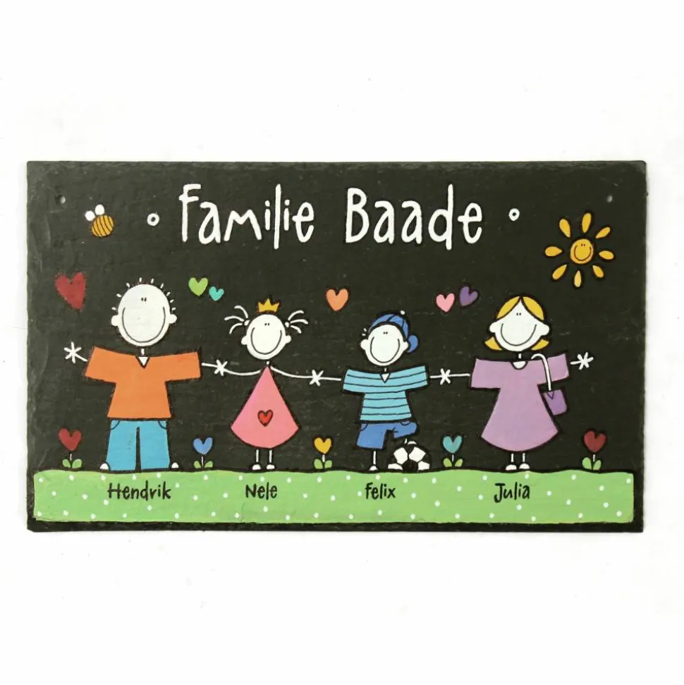 Robuste Schieferplatte für Familien: Wetterfest, langlebig und pflegeleicht. Bemalt mit hochwertigen Farben, widersteht das Schild Sonne und Regen problemlos. Dank umweltfreundlicher Herstellung ist es nachhaltig sowie ökologisch wertvoll.