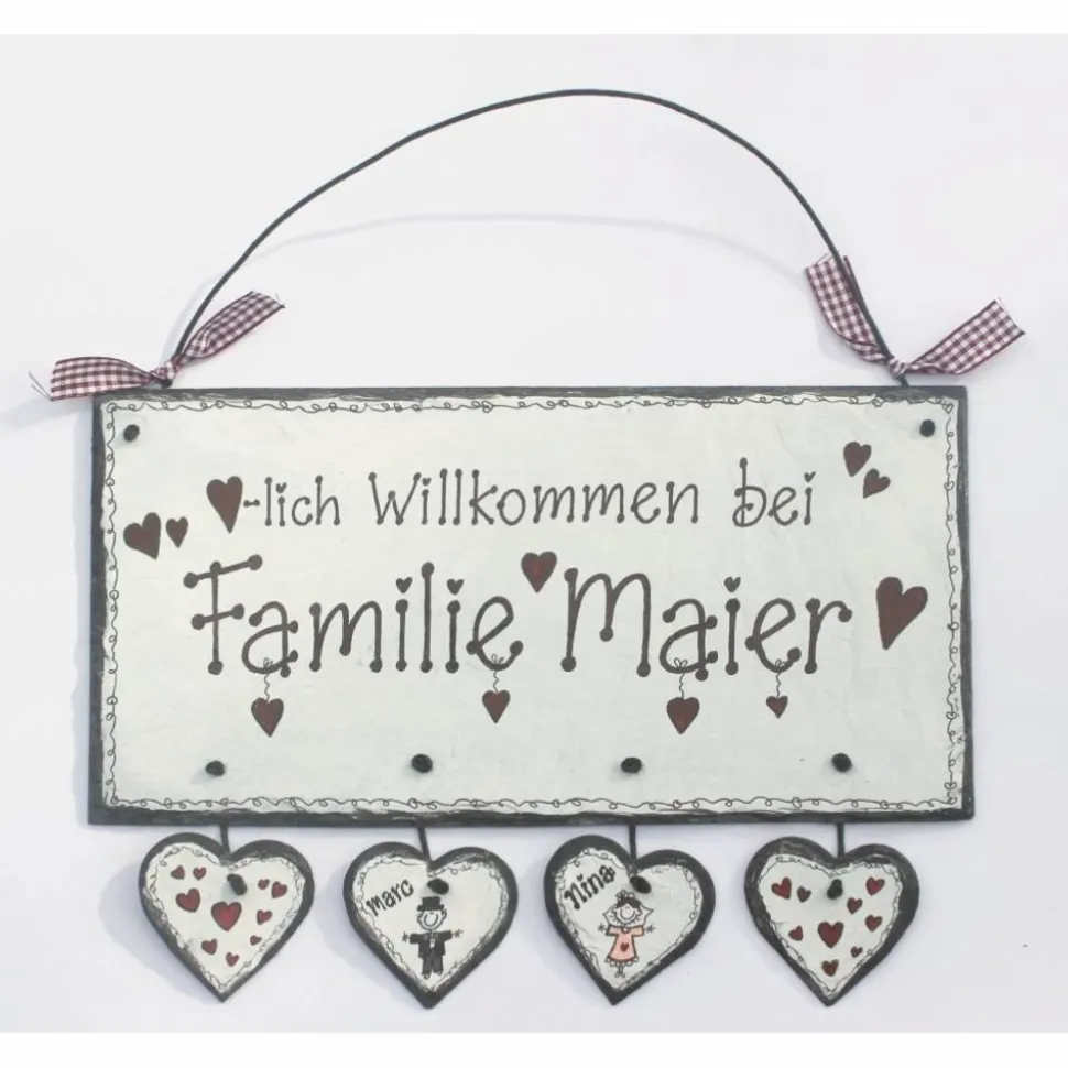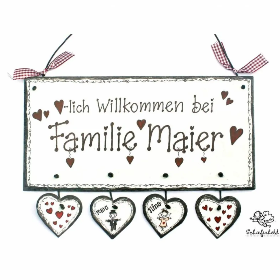 Das Schild ist weiß grundiert, zweizeilig in Deiner Wunschschriftart mit „-lich Willkommen bei Familie“ und Nachname beschriftet und mit vielen roten Herzen verziert. Du erhältst dazu 3 bis 6 Herzanhänger aus Schiefer (je nach Auswahl):