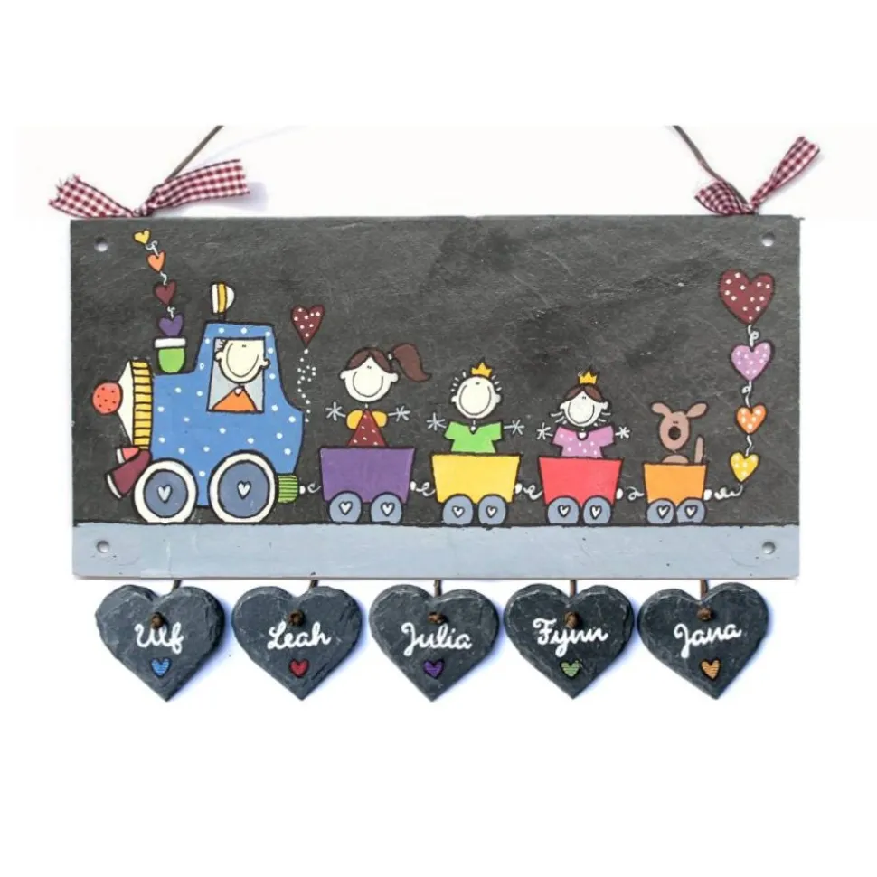 Dieses exklusive Familienschild aus Naturschiefer ist ein echter Blickfang für deinen Hauseingang. Jedes Türschild wird mit deinem Familiennamen sowie den Vornamen aller Familienmitglieder versehen. Die blaue Lokomotive und bis zu fünf bunte Waggons werden liebevoll per Hand bemalt und mit Figuren nach deiner Wahl aus der Auswahltabelle gestaltet. Herzanhänger aus Schiefer mit Vornamen machen dein Schild noch persönlicher.