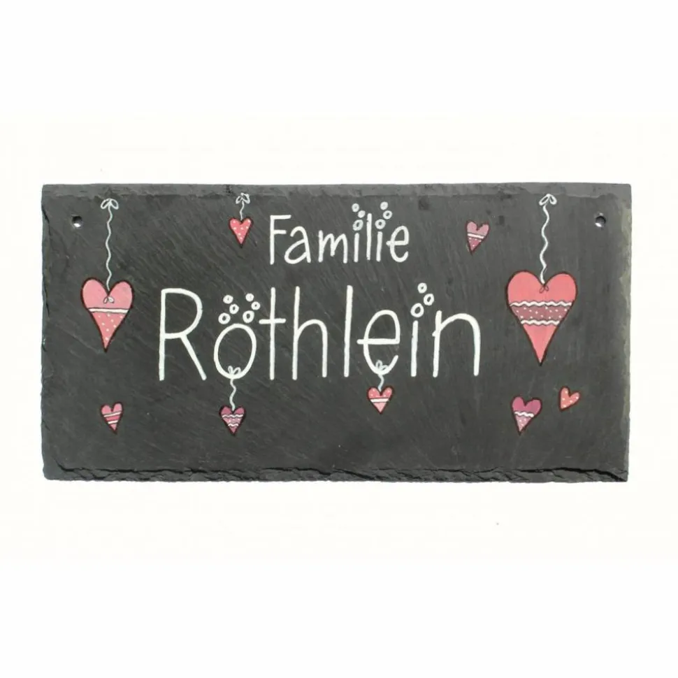 Das Schiefertürschild ist robust, pflegeleicht und langlebig sowie umweltfreundlich und nachhaltig. Es wird aus Naturschiefer gefertigt, in Wunschschriftart zweizeilig mit „Familie“ und Name beschriftet und mit aufgemalten Herzen verziert – in Rot/Rosatönen oder auf Wunsch auch in anderen Farbtönen. Herzanhänger sind ebenfalls möglich.