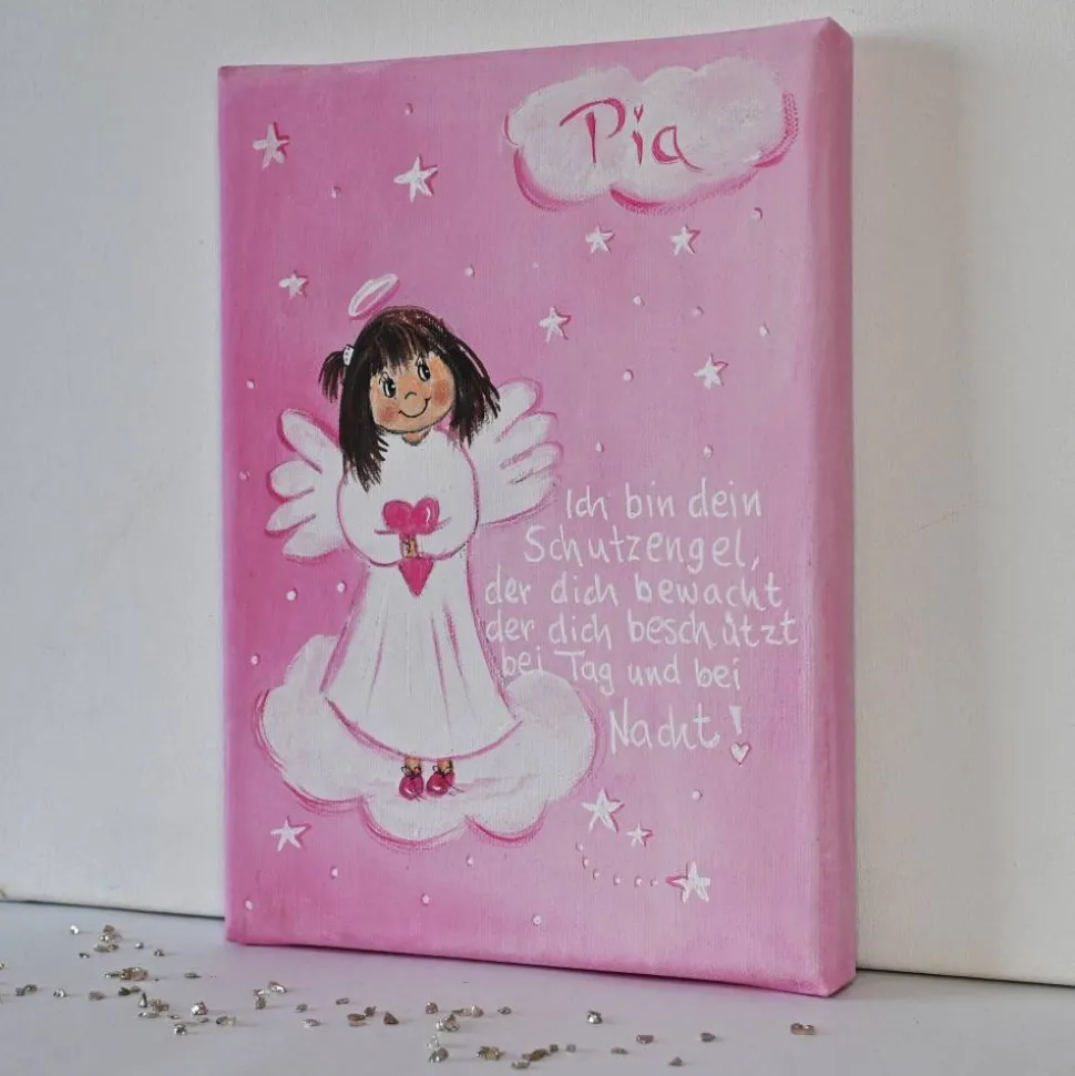 Zauberhaftes Schutzengelbild für Mädchen, individuell personalisiert und liebevoll handgemalt auf Keilrahmen. Mit hochwertigen Künstleracrylfarben gestaltet, ist jedes Bild ein Unikat – signiert und rückseitig gestempelt.