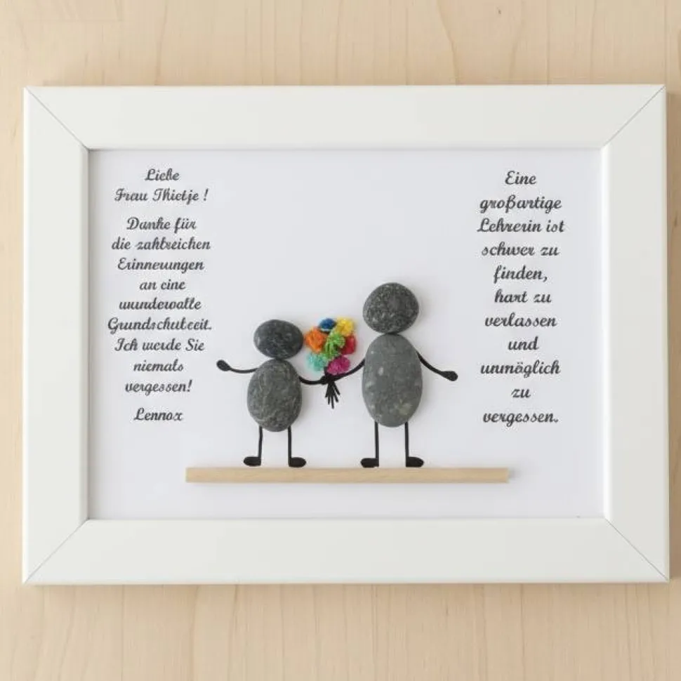 • Handgefertigtes Einzelstück – jedes Bild ist ein Unikat• Figuren aus echten Natursteinen mit liebevollen Details• Farbenfroher Blumenstrauß als Symbol der Wertschätzung• Ausdrucksstarker Dankestext für Lehrerinnen• Personalisierbar mit Namen, Datum oder Widmung• Symbolisiert Dankbarkeit, Anerkennung & Verbundenheit• Das perfekte Geschenk zum Abschied oder Schuljahresende
