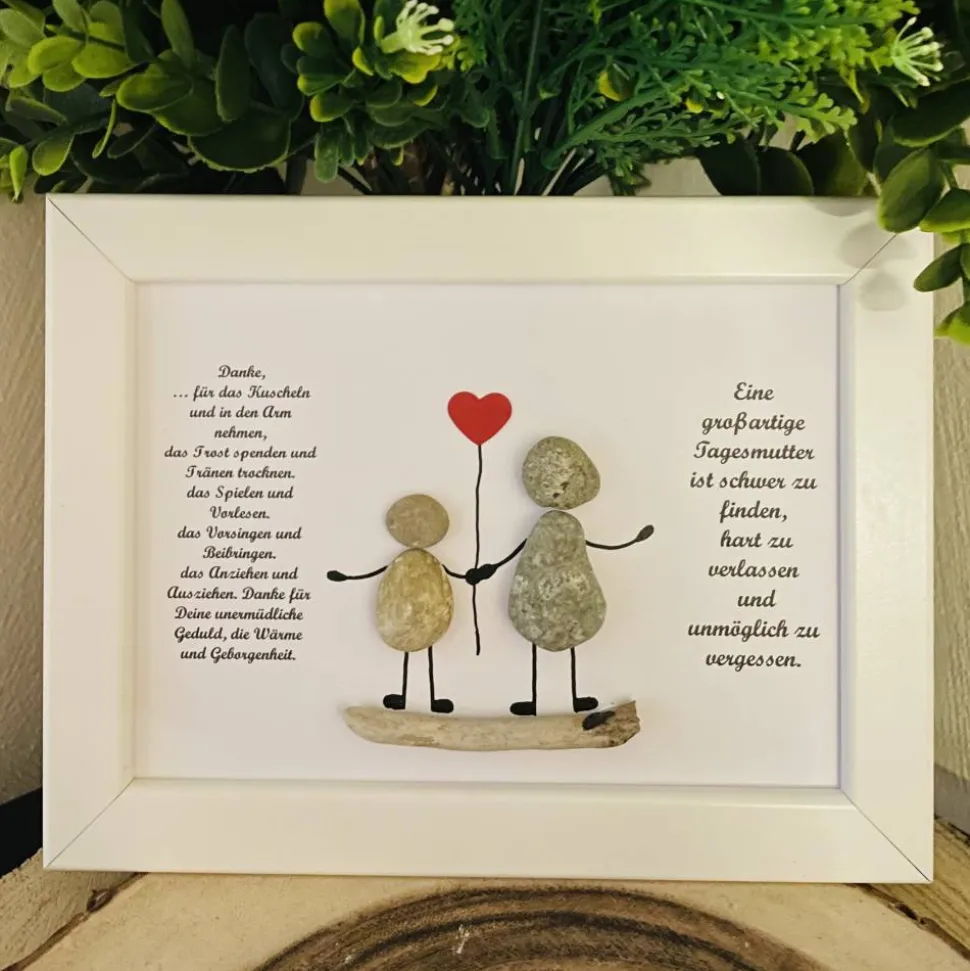 Ein wunderschönes handgefertigtes Steinbild als Dankeschön für eine Lehrerin – perfekt, um Wertschätzung, Anerkennung und Dank auszudrücken.Dieses besondere Bild zeigt zwei Figuren aus echten Natursteinen, die gemeinsam einen bunten Blumenstrauß halten, ergänzt durch einen ausdrucksstarken Dankestext, der die Bedeutung einer großartigen Lehrerin würdigt.