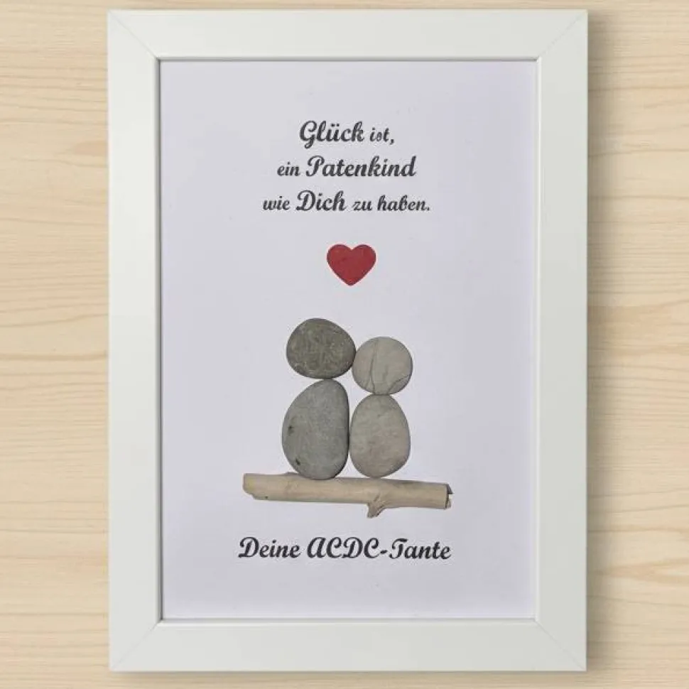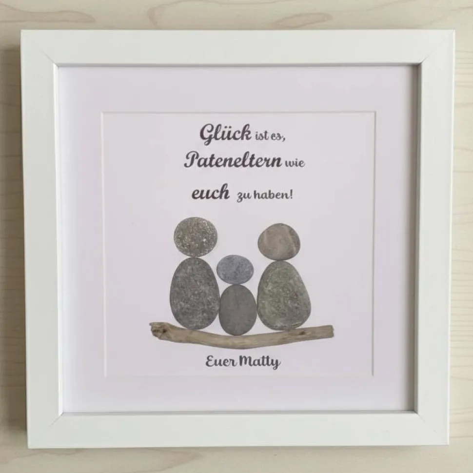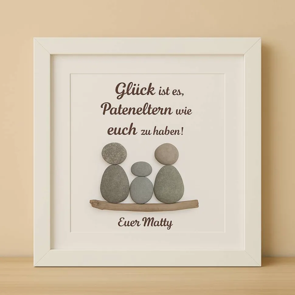 • Handgefertigtes Einzelstück – jedes Bild ist ein Unikat• Echte Natursteine liebevoll arrangiert• Warmer Dankesspruch für Pateneltern• Personalisierbar mit Name, Datum & Wunschtext• Personenanzahl variabel — frei gestaltbar nach Wunsch• Ideal für Taufe, Geburt, Babyparty oder als Dankeschön