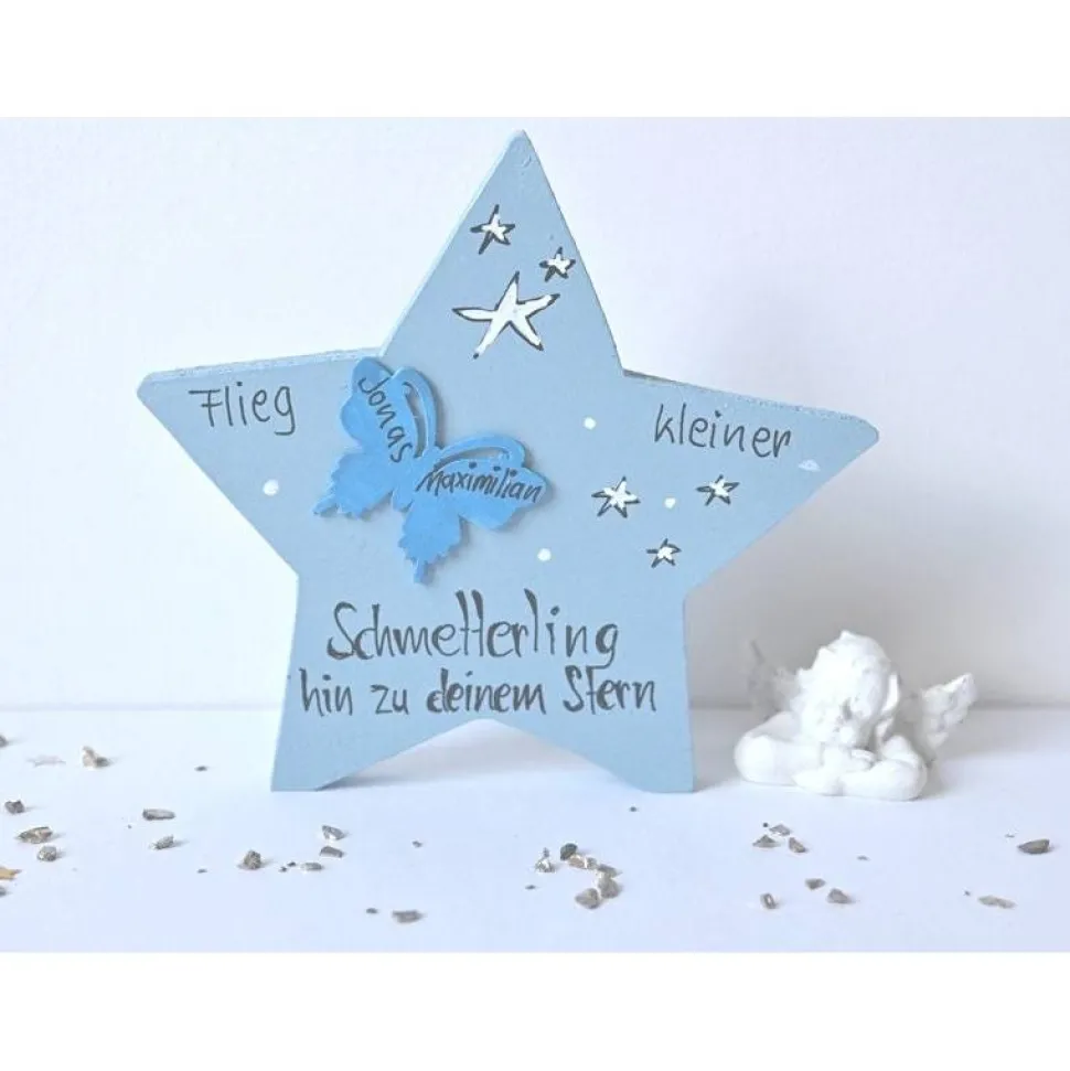 Jeder Holzstern wird mit hochwertiger Acrylfarbe in Ihrer Wunschfarbe grundiert und auf der Vorderseite von Hand bemalt und beschriftet. Der separat aufgeklebte Schmetterling trägt den Namen Ihres Sternenkindchens. Zum Schutz wird der Stern beidseitig mit Acryllack versiegelt.