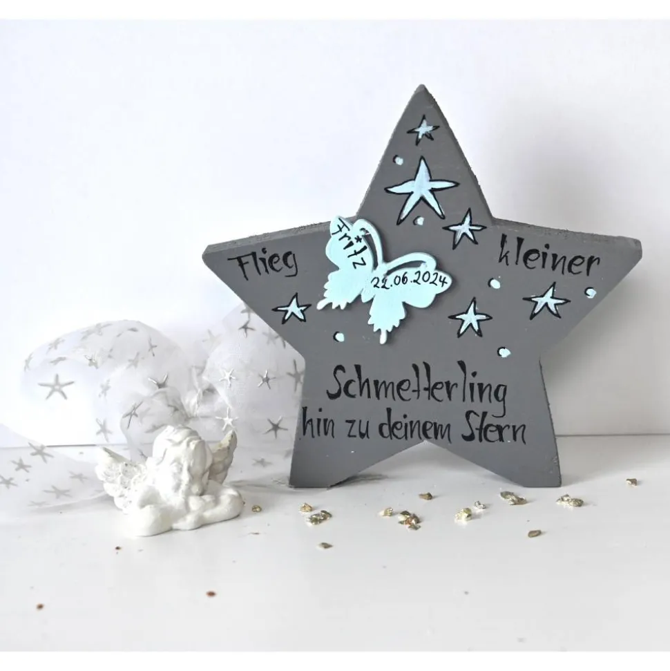 Der handbemalte Holzstern ist ein liebevolles Symbol für die ewige Verbindung zwischen Ihnen und Ihrem Sternenkind. Auch wenn Ihr Schmetterlingskind nicht mehr physisch bei Ihnen ist, bleibt die Erinnerung und Liebe für immer lebendig. Der Stern erinnert Sie daran, dass Ihr Sternenkind immer einen besonderen Platz in Ihrem Herzen und Ihren Gedanken hat.