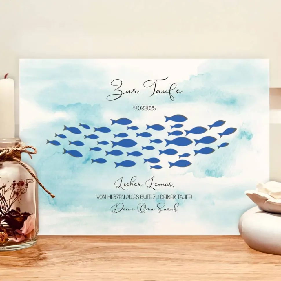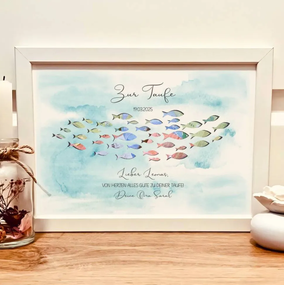 Stilvolle Erinnerung: Das Bild bietet hinter dem Schnittbild der Fische eine originelle Möglichkeit, Geld zur Taufe stilvoll zu verpacken. Der blaue Hintergrund sorgt dafür, dass der Rahmen auch ohne Geld ein echter Hingucker ist und als Dekoration in jedem Kinderzimmer glänzt.