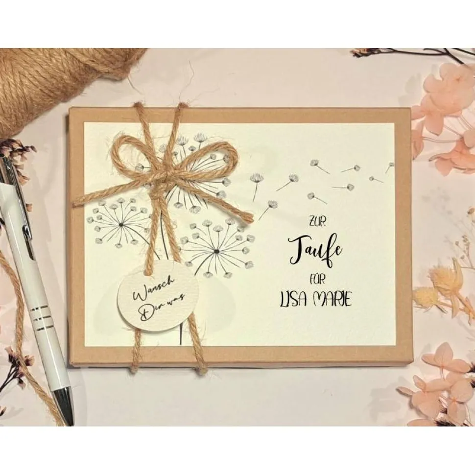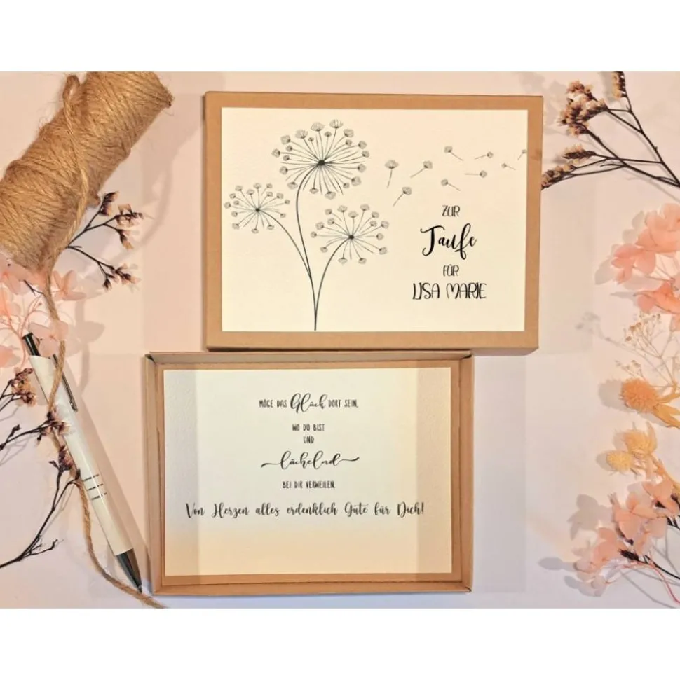 Unsere hochwertige Box aus robustem Kraftkarton ist mit einem zauberhaften Pusteblumendesign versehen und wird mit dem Namen des Taufkindes personalisiert. So verleihst du deinem Geschenk eine ganz besondere, persönliche Note.